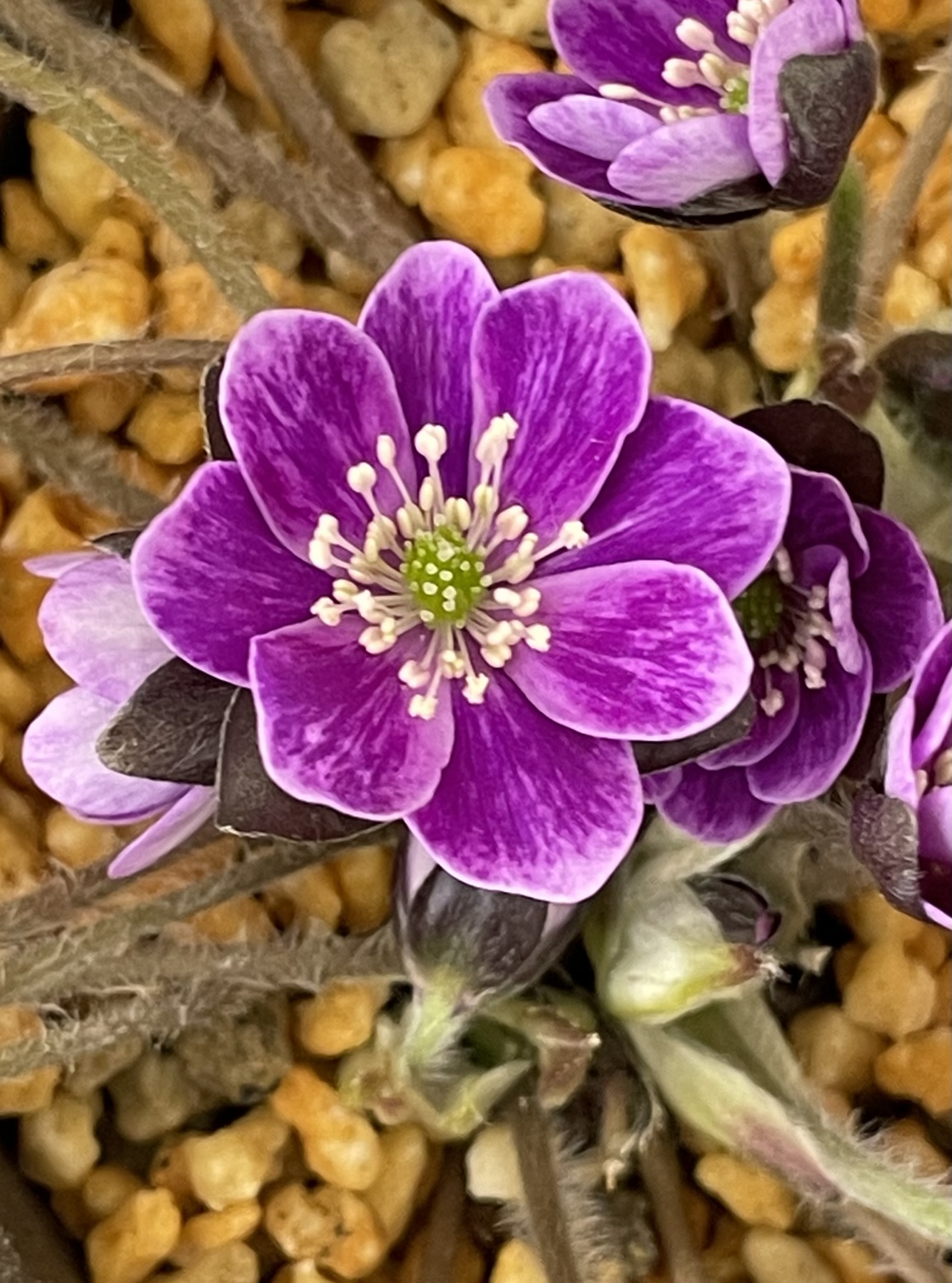 智光山公園緑化植物園センターにて!雪割草展開催してた。たくさんの品種有るの知らなかった?色もたくさん有り鮮やか!花の形も様々でした。一番綺麗だったのがコレ!名前は後ろにちょこっと見える?花弁の数、色、模様が綺麗です。色の組み合わせが良い。似てる様で違う。花弁のふの入り方が良い。何とも可愛い!ROOMにも遊び来て下さい。