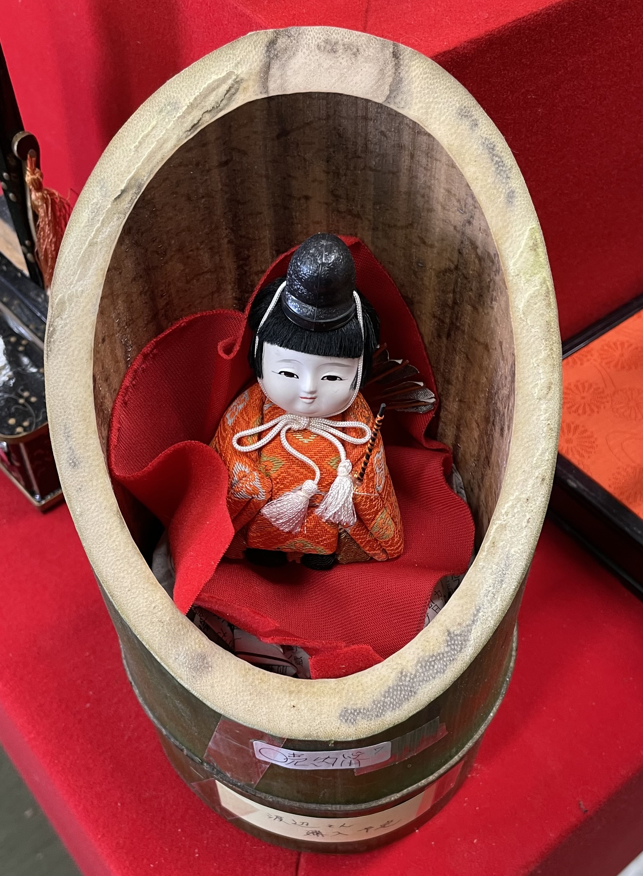 奥富ひな祭会場ひな壇に置かれてた?かぐや姫!大きな竹の中に!飾られたひな人形!かぐや姫の様です。小さな人形作るのも大変かな?童の人形!ROOMにも遊び来て下さい。