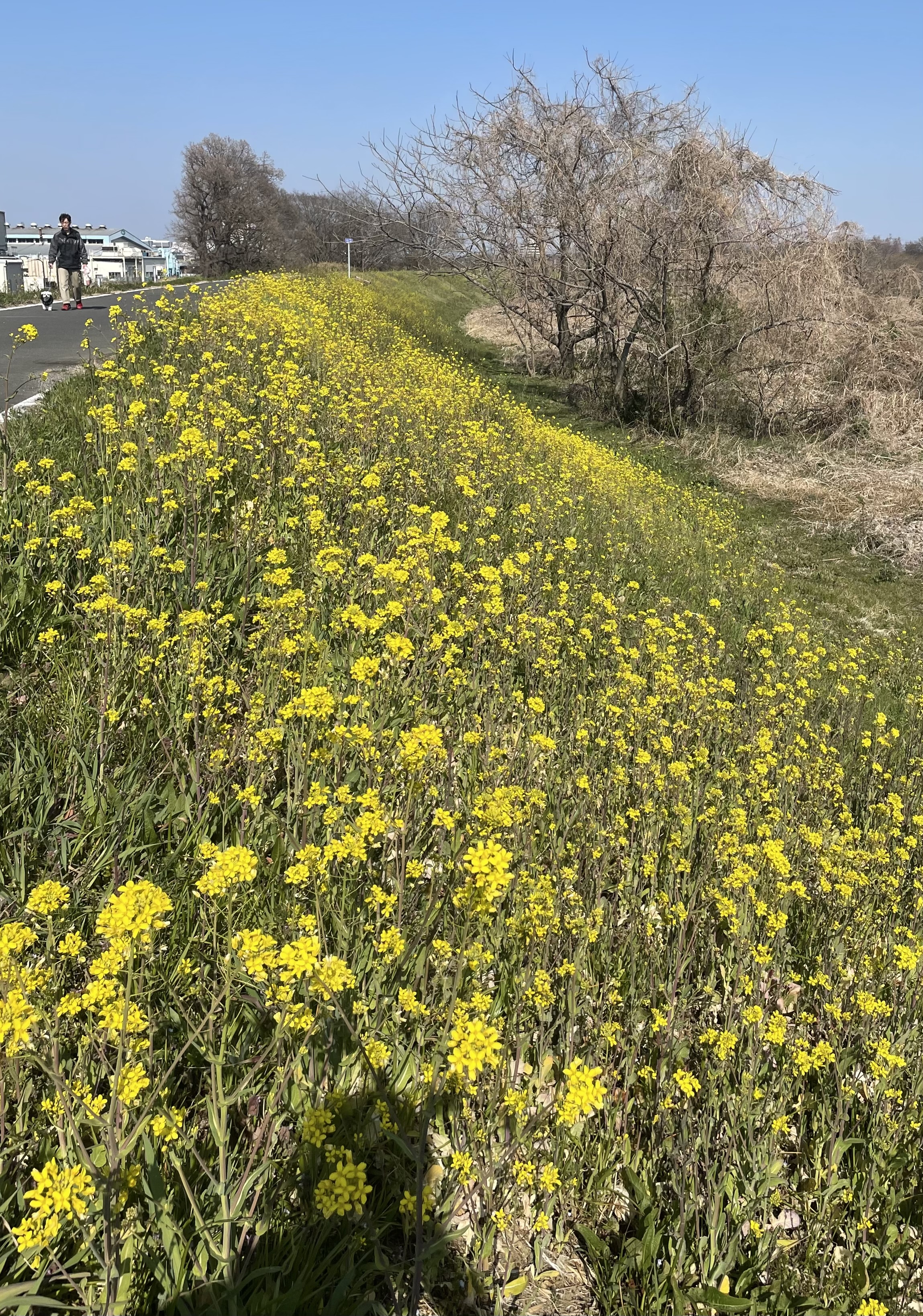 入間川河川敷の堤防土手の上はサイクリングコース!土手の両サイドには菜の花が満開!今年は開花が遅かった気がする。数も少ない様に感じる。昔は一面黄色に染まった。誰が蒔いたでも無い。毎年綺麗に咲いてくれる。咲いては種が落ちる?青空に黄色い菜の花は合う。今日は暖かくのんびり出来る。長く咲くので見頃も長い。桜が満開に成るまで咲いて居る。ROOMにも遊び来て下さい。