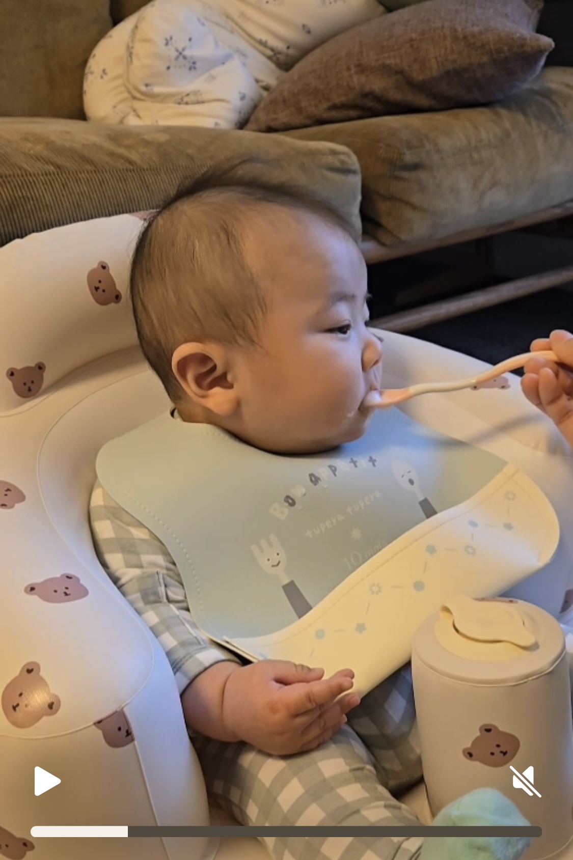 最近の孫ミルク以外初めて?初めてのもぐもぐ?お粥を食べさせた様です。味が分かるのかな?世は満足じゃってな感じ!腹いっぱい食べたのかな?大きく成ってね!瑛君!仲良しになろうね。ROOMにも遊び来て下さい。