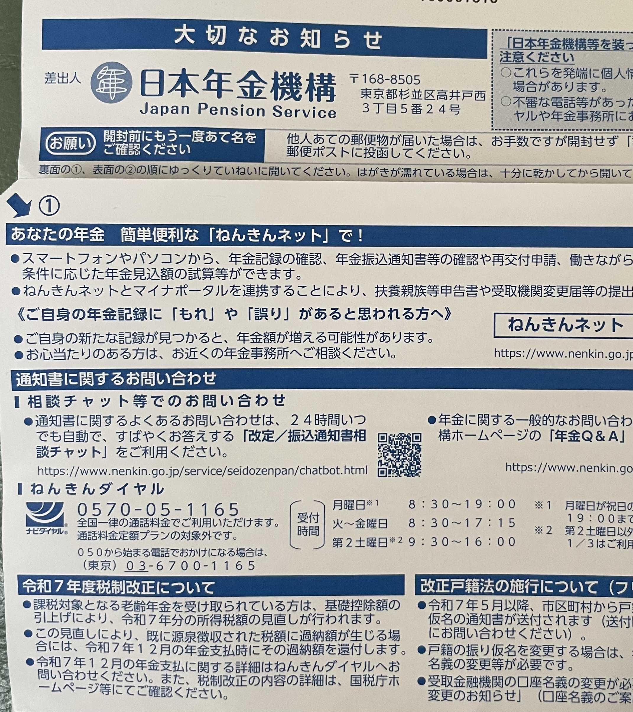 年金の知らせが届いた。また年金額が下がるのか?年金額改定のお知らせ。毎年下がる知らせは来ていたかな?何時も良い知らせなど来ない。介護年金も強制的に取られるし?良く見ると1.9%増額改定とある?支給額が増えるって事?少し位増えても、税金、介護保険でガッチリ取られる。私など病気したけど、介護保険使える事が有るのだろうか?使わず生涯終わりそう、でも健康第一!元気に遊びたい!ROOMにも遊び来て下さい。