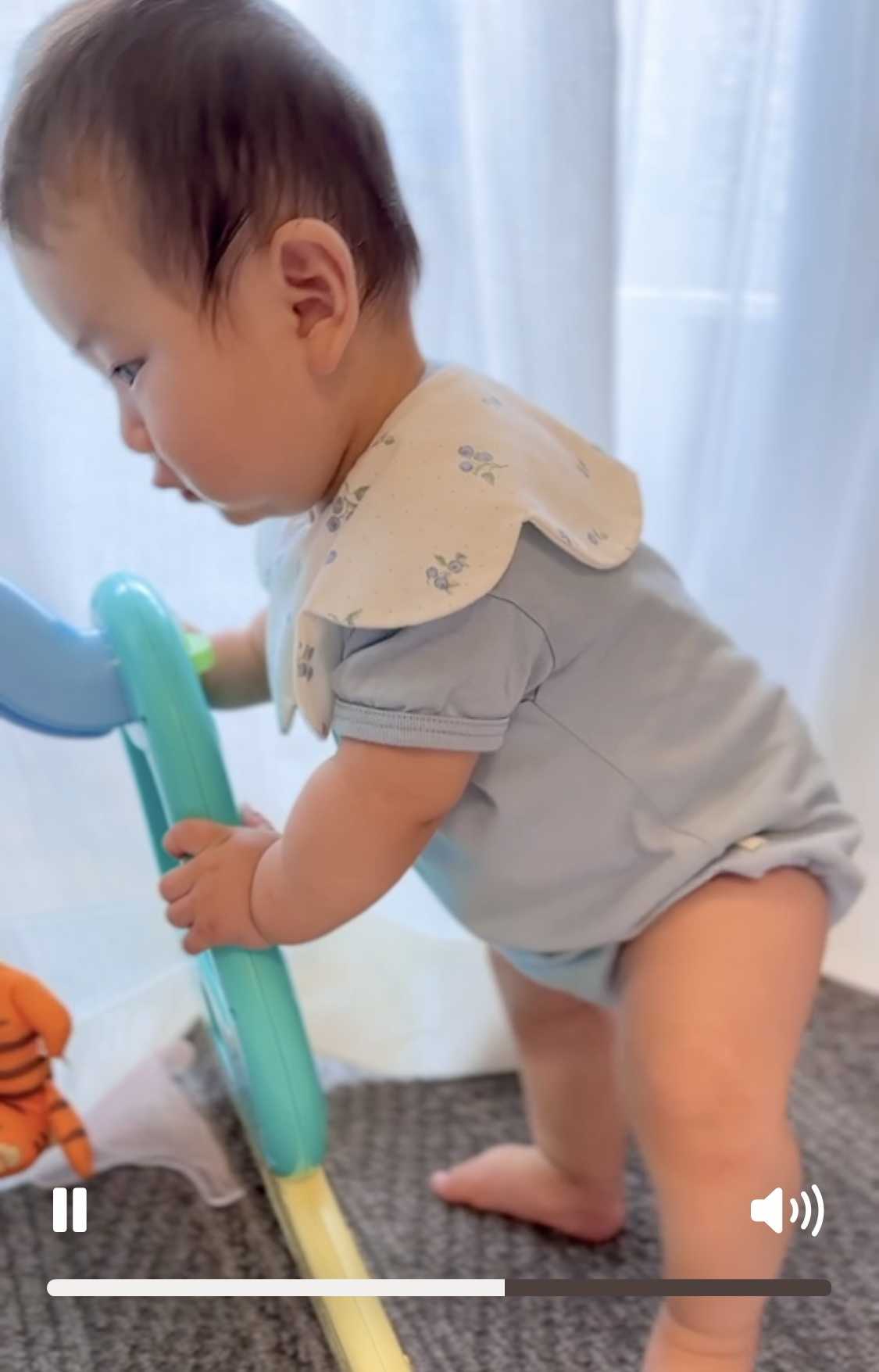 大分成長して来ました。捕まり立ちをする様に成った。動画ではフラフラしながらも立ち上がった。動画の切り取り写真です。やっとこ立ち上がった。フラフラしてる。高い所のおもちゃに手を伸ばす。でも届かずフラフラする。力尽きお座り。大きく成ったね!今度会う時は!ハイハイダッシュするかな?今度合うのが楽しみだ。ROOMにも遊び来て下さい。