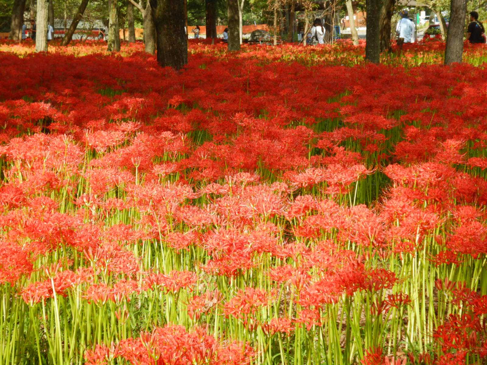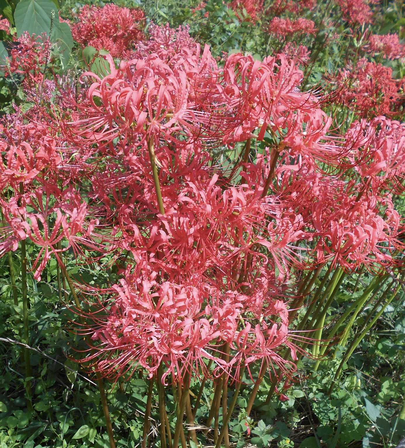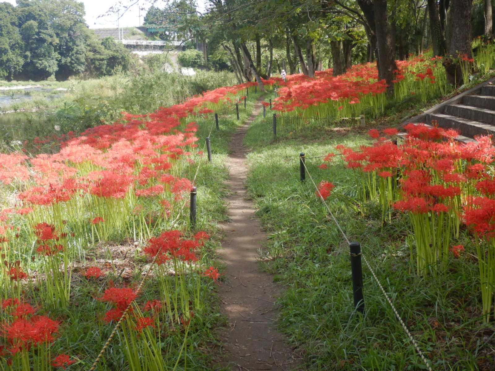 入間川の上流の入間市河川敷の彼岸花公園。彼岸花が満開を迎えて来た。堤防の土手。河川敷の遊歩道!桜並木の下で満開です。陽当り具合で咲き具合が違う。蕾も少し有るがほぼ満開です。近くに駐車場が無い。そんな関係で訪れる人が少ない?長さ500m位咲き続いてます。川沿いで涼しい風が吹き気持ち良い。ROOMにも遊び来て下さい。