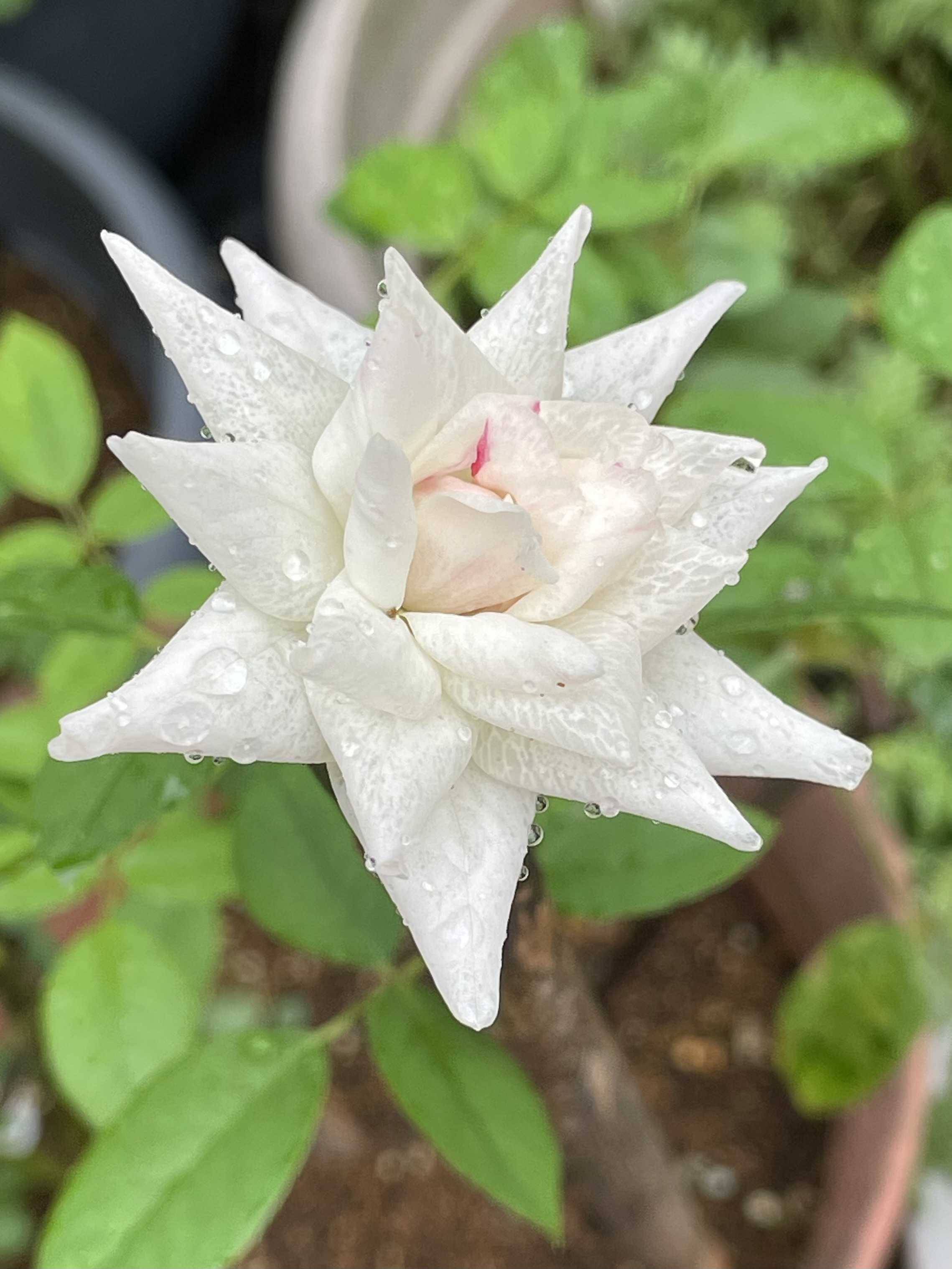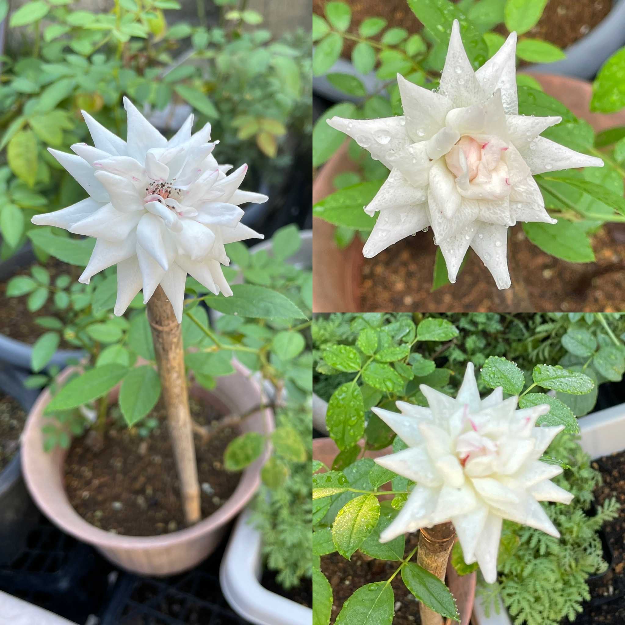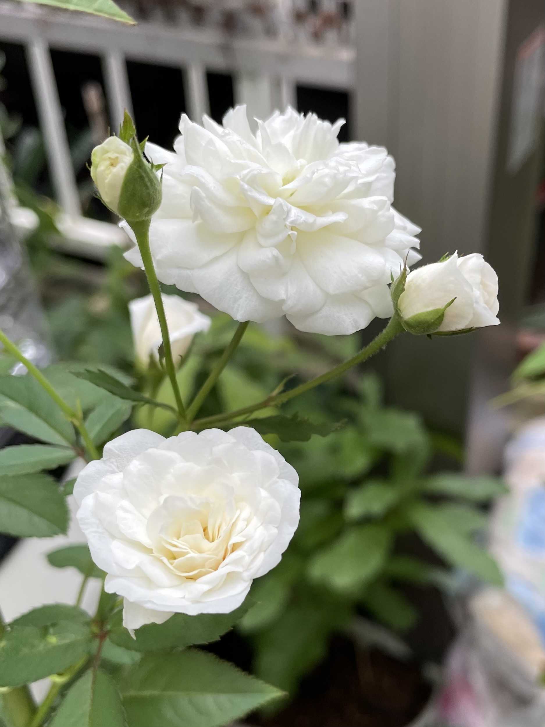 我が家の薔薇暑い中少し咲いてます。新芽が出て来た薔薇は日陰に移動した。強い陽射しで薔薇も大変そう。前日日陰、午前日陰、午後日陰へと!鉢植えは多少移動した。ホワイトメイディランド、房咲きです。純白が綺麗に咲きます。グランデアモーレこれ位の開き加減が好きです。今我が家で咲いてる薔薇は全て白色です。琴音これも白い花で綺麗に咲きます。開き切るとピンク色が出て来る。フラウカルドゥ開き切ると剣先、花先が尖ります。純白で傷み安いです。ホワイトメイディランド開き切ると花弁が丸まって来ます。花持ちが良く長く咲いてます。