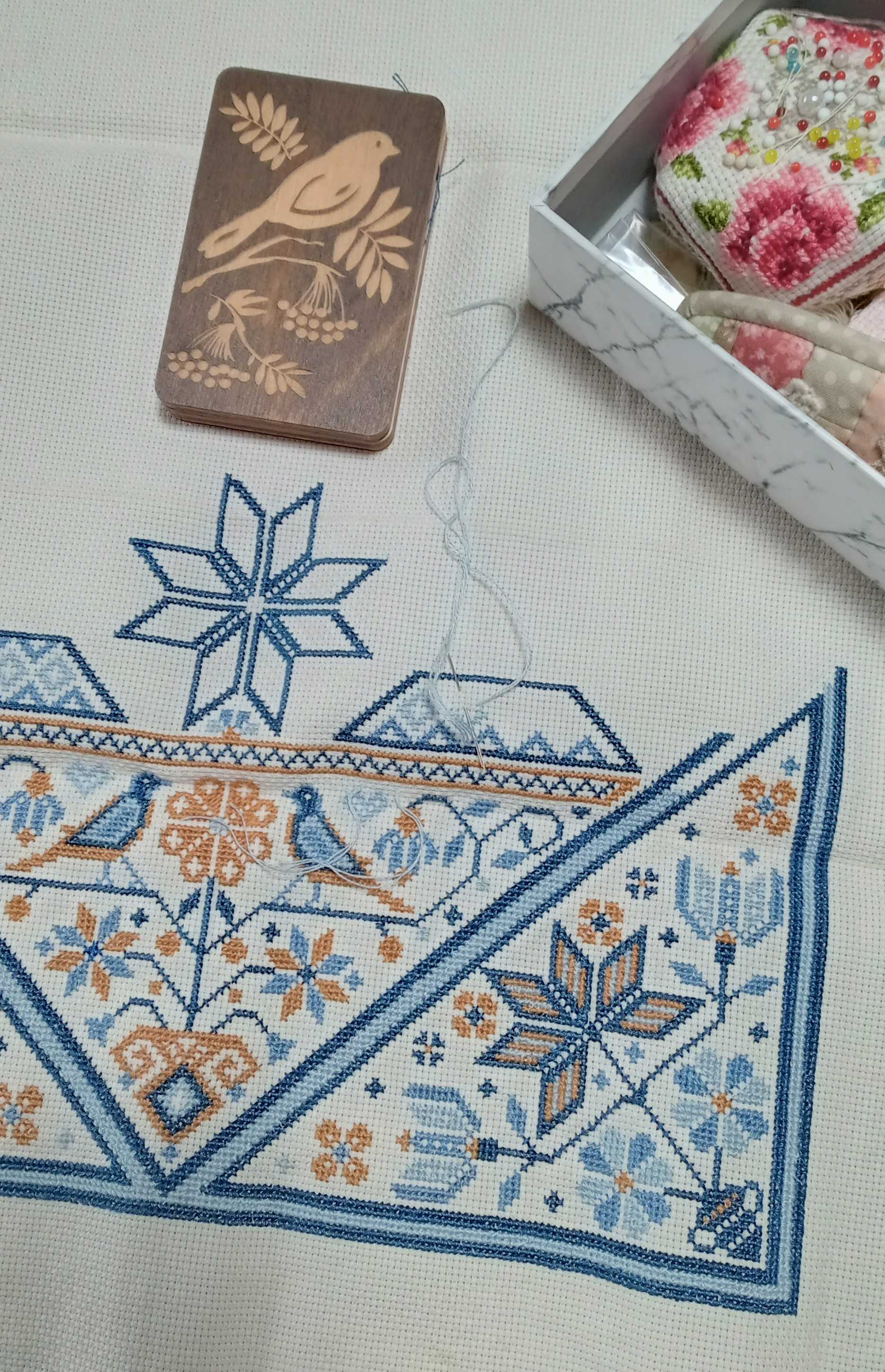 表題私の事ではありません(笑)ウチの会社で、最初に雇用した社員さん来年1月に めでたく定年退職となりますウチは法人とはいえ私達夫婦と、主人の弟夫婦で経営する小規模事業所長い間、社員を雇用するなんて 夢のまた夢でした30年程前、知り合いから紹介された彼この仕事が気に入ってくれたみたいでアルバイトから正社員へそして 定年退職を迎えるまで勤めてくれましたそして60才から更に 再雇用も承諾して貰いとても嬉しい事となりました皆さんにも聞いて頂きたくて^^涼しくなったので久しぶりに手仕事クロスステッチ、引っ張り出しました~(笑)始めたのが 2022年ですから3年物(笑)小鳥模様の箱はニードルリマインダー(針休め)お針刺しに、いちいち刺すのが面倒でこれは、磁石にポイっと置けば良いので楽ちん&可愛い♪