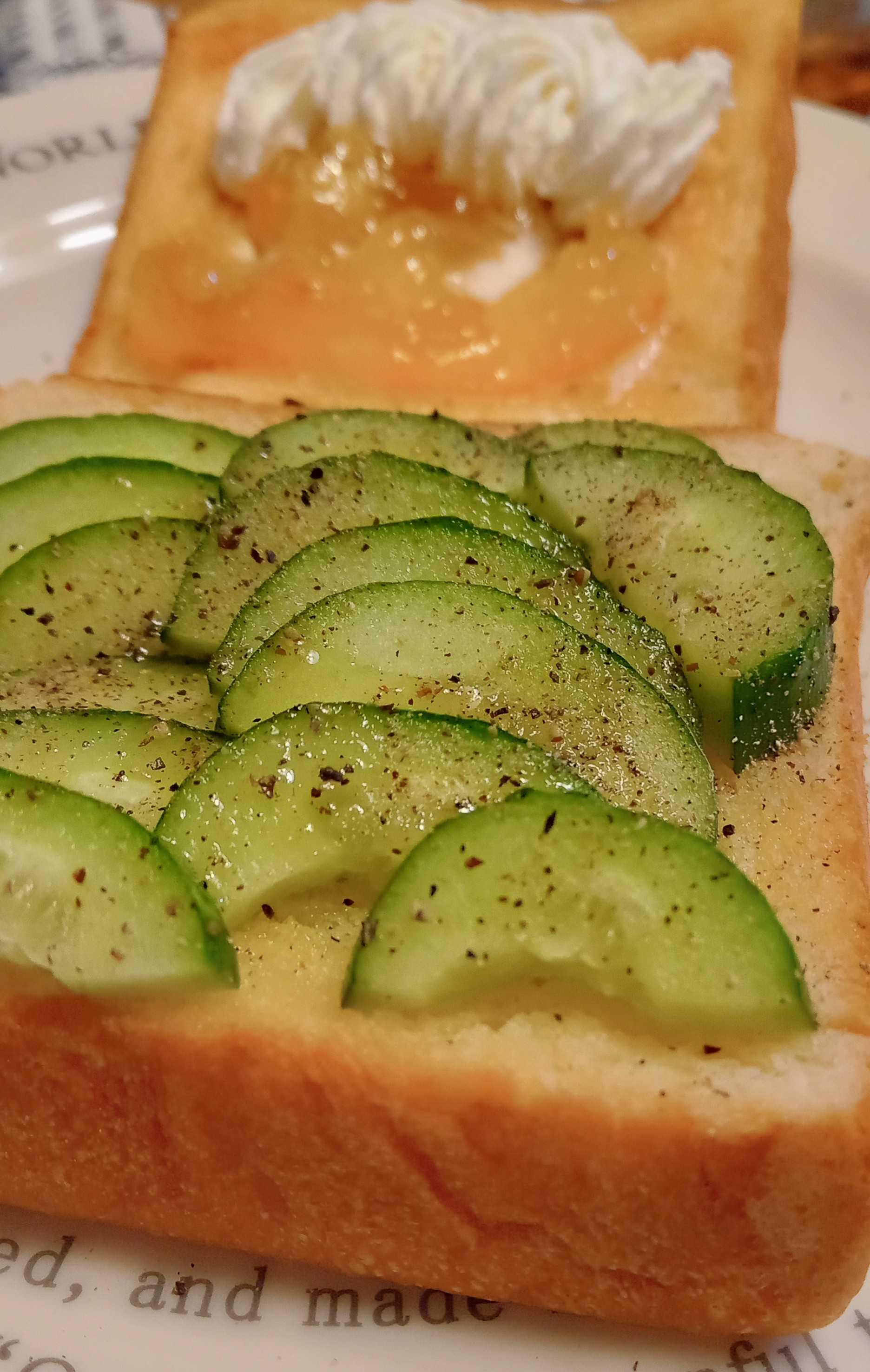 半年以上、放置していたブログを再開したのは、大した事じゃなく自分でもよくわからないのだけれどそれでも、分析してみると ですね~(笑)「お喋りがしたくなった」これに尽きると思う例えば 朝ドラ嵩 ← 呼び捨て(笑)良い奴だけど、いかんせん 歯がゆい!私は断然 次郎さん派! とか羽多子さん、サイコー とか大河も政云々は良いから、もっと忘八のオジサンたちの話を見たいわ~ とかそんなあれこれをまた、 皆さんとここで話したいなぁ~ なんて思ったのです^^さて、今日はお休み気楽なお昼ご飯は こちらきゅうりのトースト飛田和緒さんのレシピバターを塗ってトーストしたパンにきゅうりの薄切りを乗せて オリーブオイルをたらり胡椒を振って 頂きます♪美味しいのよ~後ろに見えるのは 背徳のマーマレードと生クリーム♪因みに食パンは 7cm角のミニ食ですよ~