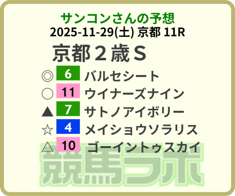 ▲ 7 サトノアイボリー(団野大成) 【理由】京都リーディング上位、杉山晴紀厩舎の管理馬です。 エピファネイア産駒は京都2000mでの複勝率が高く、長く良い脚を使えるのが特徴。新馬戦の内容も良く、叩いての上積みが見込めます。団野騎手も直近G1を制するなど勢いがあり、人気の盲点になり得る実力馬です。