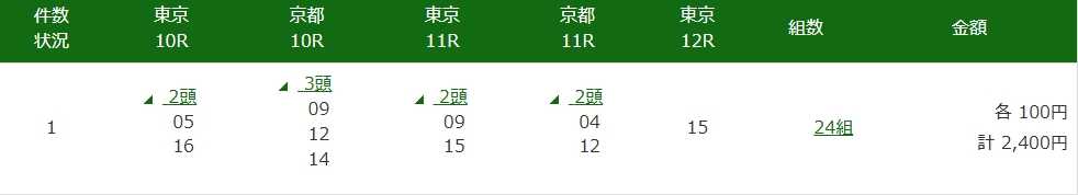 今回のWIN5は、1レース目と5レース目が比較的堅いと判断し、合計24通りの予想で勝負します。