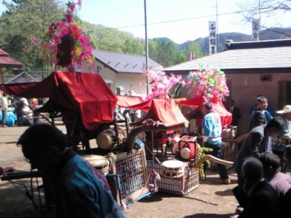 夜更かししてつい寝過ごして朝の日差しで部屋が暑くなり目が覚めた。あわてて用意して家の裏のグランドへ行った。今日は地区のソフトボールリーグの我がチームの開幕前の練習日、グランドに上るともう皆来ていた。なんか自分が一番最長老になってきた。打撃もバットから快音って感じで無いし、外野の守備練習も球を追いかけて走るのがきつい。練習の後グランドで缶ビールを飲んだ。炎天で久しぶりに汗だくになったのでうまい。そして帰ってボーッとする間もなく午後は村の春祭りでまた忙しく飛びだす。集会所前で神楽を組み立て、出発前にまず一杯、神祭係りから頂いて神社へ向かう。以前は12日に当地区の諏訪社の春祭りがあったが、連休中の4日になってから、また賑わうようになった。神社の境内で神楽の周りでまた神祭の用意したビールや酒を貰って呑んで祭事、獅子舞などの後、直会で社務所兼の公民館に上がって又みんなで一杯。いよいよ終わって帰り路、神楽は神祭の家のほうを周り路して神楽囃子をして、またそこで一杯頂く。やっと集会所に帰り着き神楽を収納して、集会所に入って獅子舞の後、慰労でまた一杯が始まった。酒びたり。まーどこでも祭りはこんなもんだけど、一日よく呑んだ。もう酒は要らない、でも明日もまたのむのだろう。
