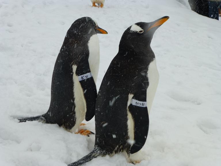 ペンギンのお散歩タイム。雪降る中、まったりと広場でお休みモードになりそうなペンギン。ボン(左)「おい、ここはお客さんの前やで、こんなとこでお休みモードでどうするんねん」かつお(右)「だってさぁ~、狭い檻からでて、雪降る中で、お散歩だよ~。お客さんだって、俺たちのまったりとした姿に癒されてるんだからさ、ここで一休みしよ~や」そんな、水族館のジェンつーペンギンでした。昼は、スシザンマイ。サバが旨い。