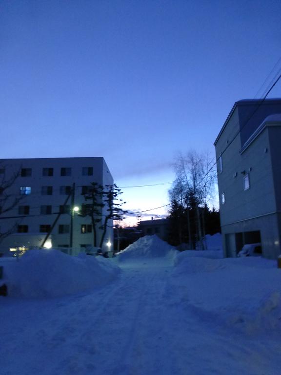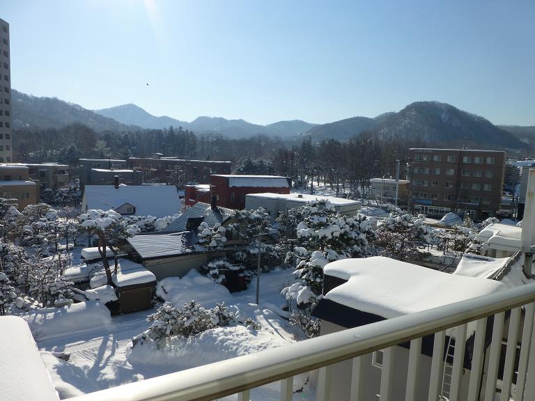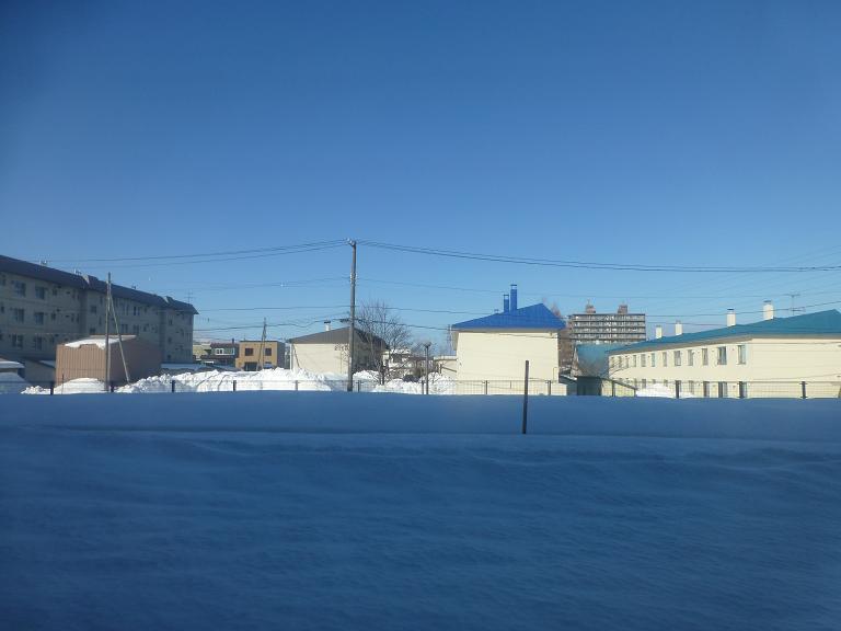 7時頃に過ぎる発寒橋に明かりはもどりつつあるが、週末に降った雪がたっぷりと残っていた。病院の昼休みの庭。向こうの囲いネットの上の方まで雪が積もった。なかなかエンジンのかからない月曜だが、大滝詠一に背中を押されながら出勤。