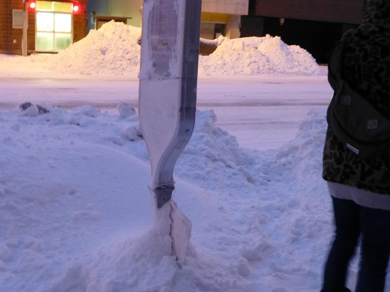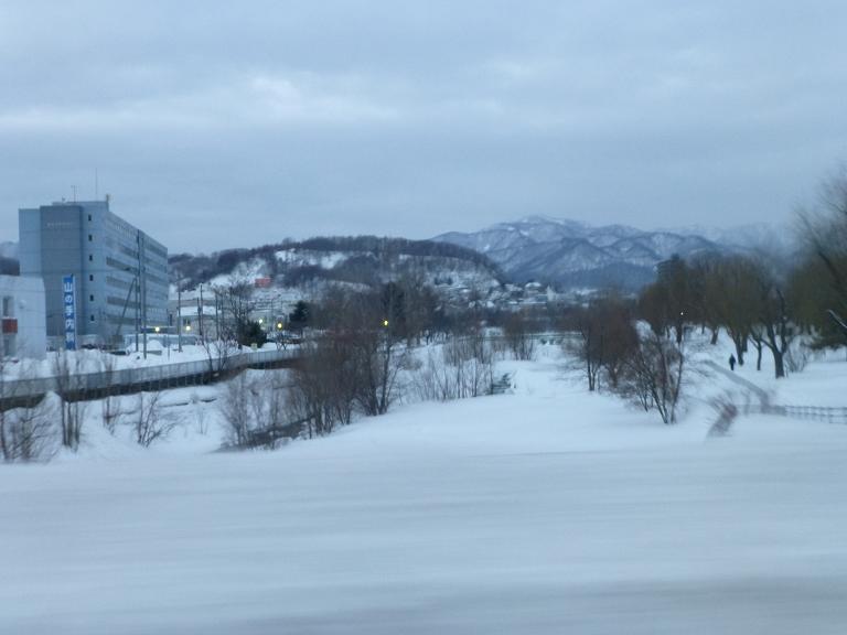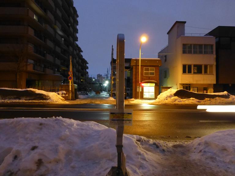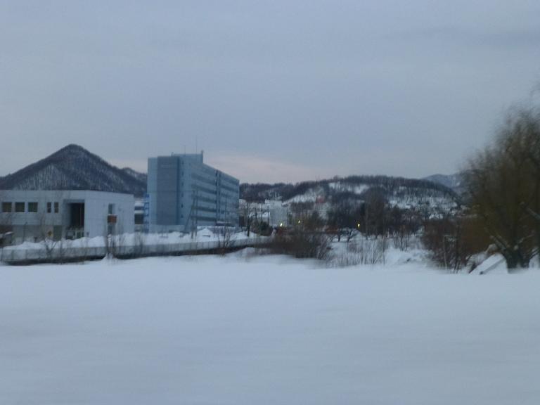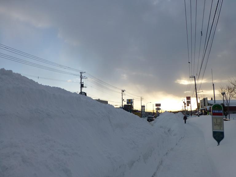 昨日の冬の嵐が去って、今日もいつも通りにバス停に向かった。すでに並んでいる女性がいたが、除雪のあとで、バス停の前には雪の壁が出来ていた。それを踏みつぶして、バスに乗るルートを開いたのがこのくぼみ。バスが来たら、雪の壁が乗るときに不便、、、とは思わないのだろうか、どうにかなると思うのだろうか、誰も壁を壊すことをしない、そのことの方が私には気になる。どうせ時間がある、と思って踏み固めた。発寒川も雪をかぶっている。暗い冬の景色。冬の景色だ。昼に、ニュースをチェックしていたら、なんと「草太郎」が破産していた。この嵐どころか、この冬を乗り越えることが出来なかった企業がいた。雪の壁なら、修復は簡単だが、経営は難しい。残念、またひとつ、美味いものがこの世から消えた。真冬。