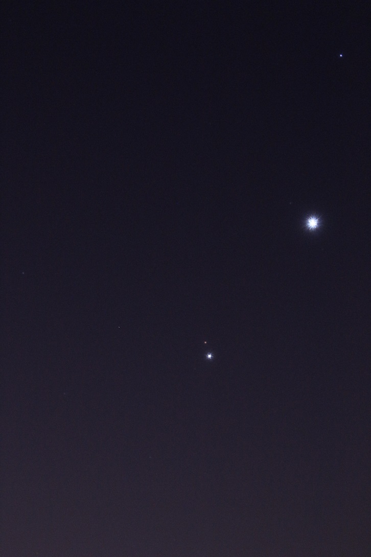 秋晴れで、昨日も11時過ぎまで星を撮っていたのに、今朝は4時に目が覚めて、東の空が忙しいことになっているのを思い出し、再び、カメラをセットした。上の超明るいのが、マイナス4等星の金星、その下の明るいのが、木星、その左上に小さく赤く見えるのが火星、で、じつは低いところに水星も見えてきたので、東の空に火水木金とそろう朝なのだ。メデタイ。ちなみに、一番右上の星は獅子座のレグルス、これも明るい一等星。その反対に目を向けると、今年初のオリオンがかろうじて見えた。冬の星座、うれしいような、冬に向かって引き締まるような。そんな朝で、快晴の空に朝日も昇り、小春日和で、円山散歩。まずはシマリスのお出迎え。冬でもないのに、手を伸ばすとゴジュウカラがもう早やってきた。やっぱり、エサはありません。スマ!いい汗かいて、そのまま円山動物園巡りをして、大学でお勉強し、歩いて帰宅、よく歩いた。いい天気で、いい秋の一日。
