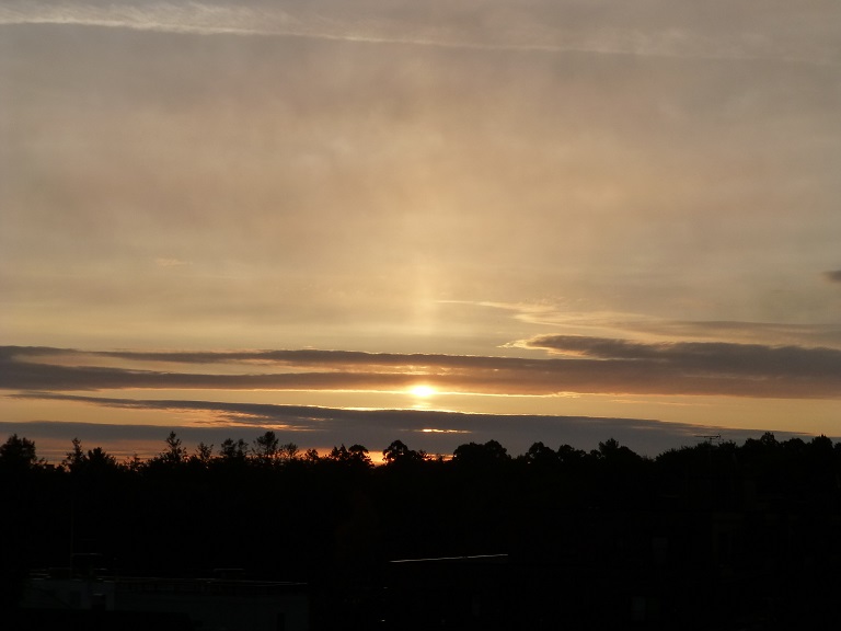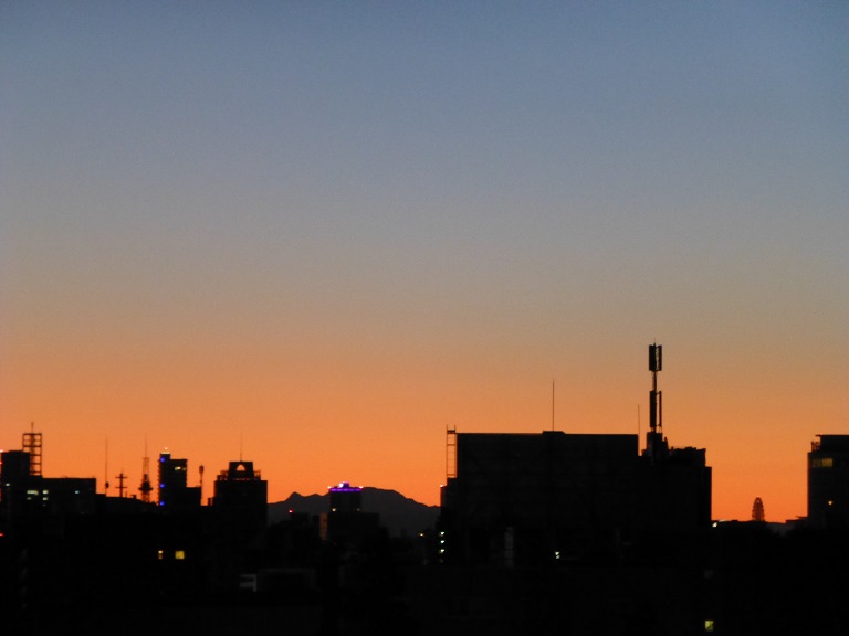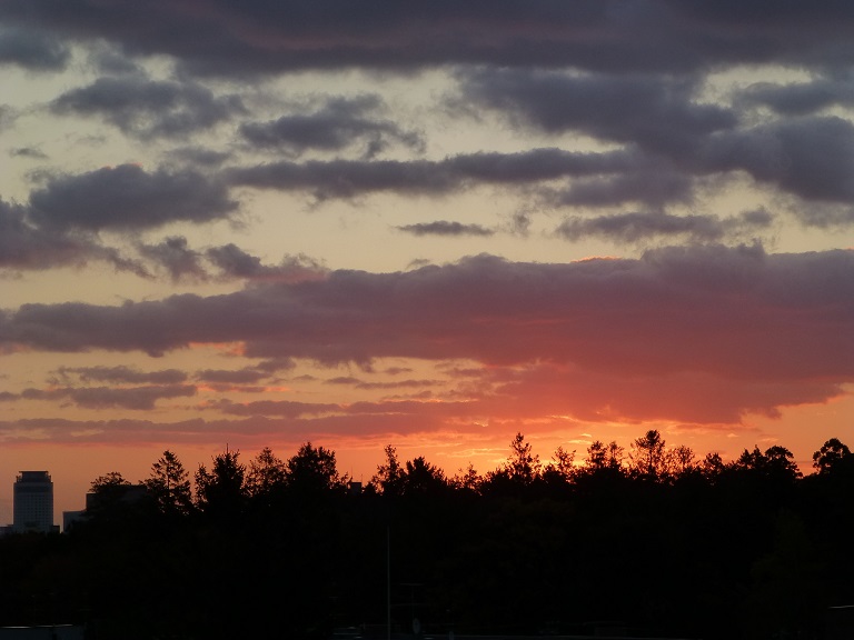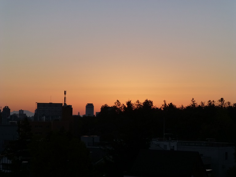 今朝も快晴、夕張岳のシルエットが朝日に映える。中央に円筒形のプリンスホテル、その右に円山公園の森が見える。今、朝日は中央やや右寄りの円山の森にかかったところから上がってくる。気温7度ほどで、寒い朝だが、気持ちがいい。夜7時も快晴の空、今晩は国際宇宙ステーションが見える。左端の三角山の右側から、うっすらとわずかに右上がりの薄い線を引いているのがそれ。400キロの上空を90分で地球を一周している。7月23日から乗り込んだ油井さんが76日目を迎えている。いい朝、いい夜、だが、明日は名古屋に飛ぶというのに、台風がこっちに向かっている。無事に飛ぶか、あしたはどっちだ。