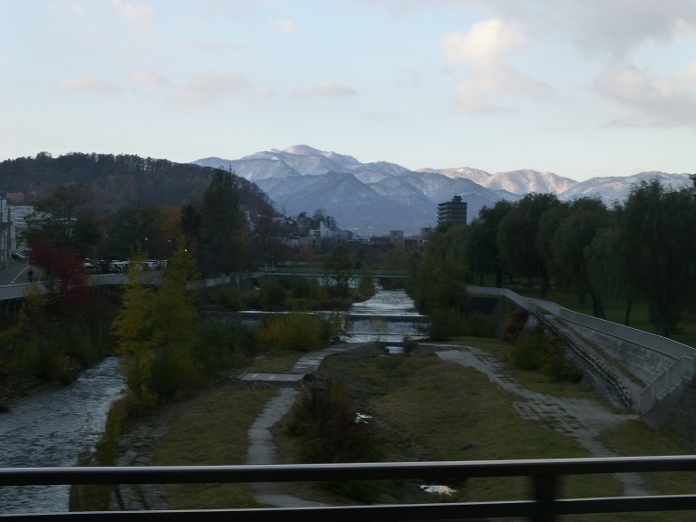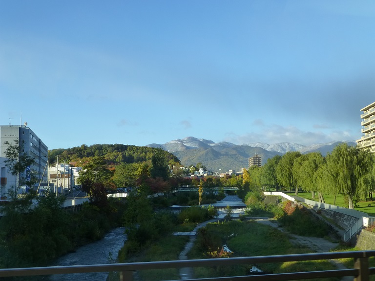 今日の発寒川、青空と奥の山の白さが引き立つ。手稲山もたしかに冠雪している。冬将軍が、ちょっと名刺代わりにね、と置いていった雪景色だな。北アルプスの山小屋も営業を終えたところがあり、間違いなく夏は終わった。