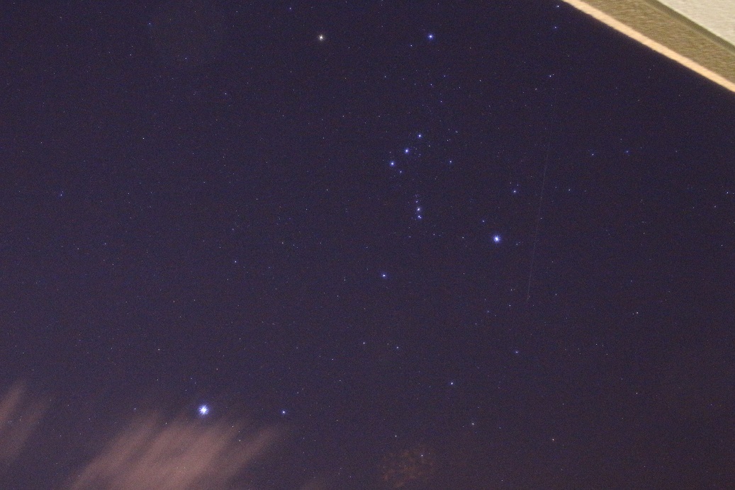 今朝、3時目に目が覚めて、、、オリオン座流星群が極大になっていることを思い出し、空を見ると、なんと晴れ。カメラをセットしている間に、それと思われる流れ星を見たが、2時間分セットして、撮れた写真がこれ。右側の下に向かう光が、流れ星かもしれないが、もしかしたら、人工衛星かも。流れ星としても、オリオンの右手から放射状に出ていないので、たぶん、オリオン座流星群ではない。ちなみに左下のひときわ明るい星はシリウス、一等星。今朝、いつものバスでは、居眠りばかり。さすがに眠かった。今晩も天気がいいようだ、、、明日、また3時に目が覚めそう。寝不足の季節となった。