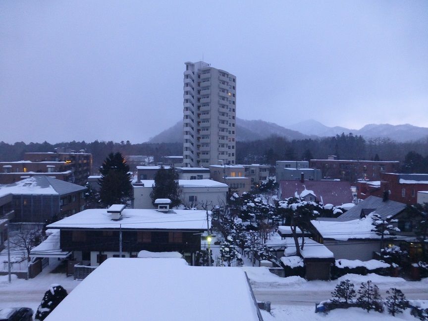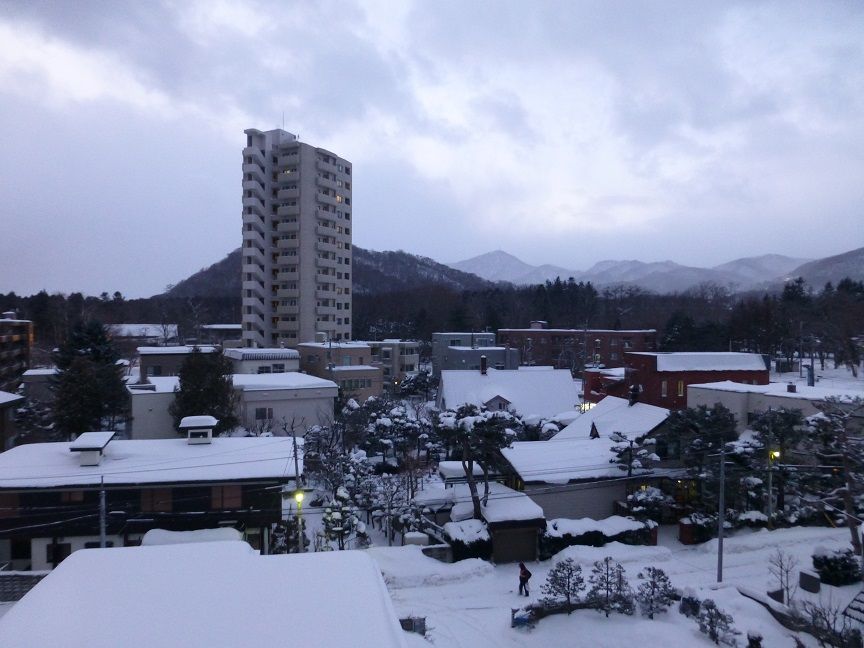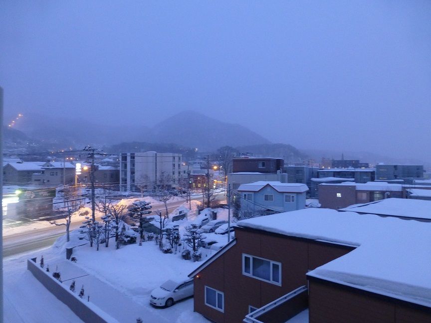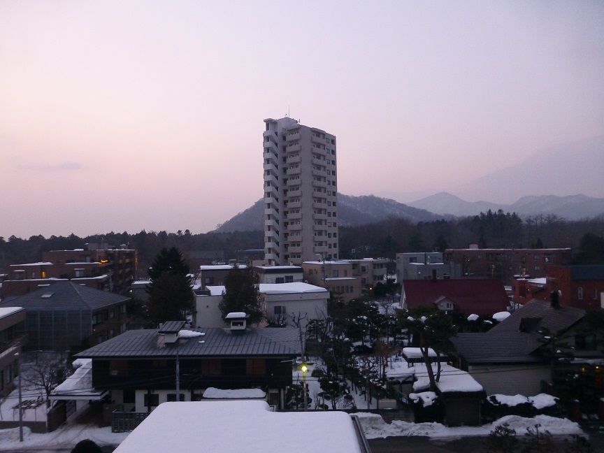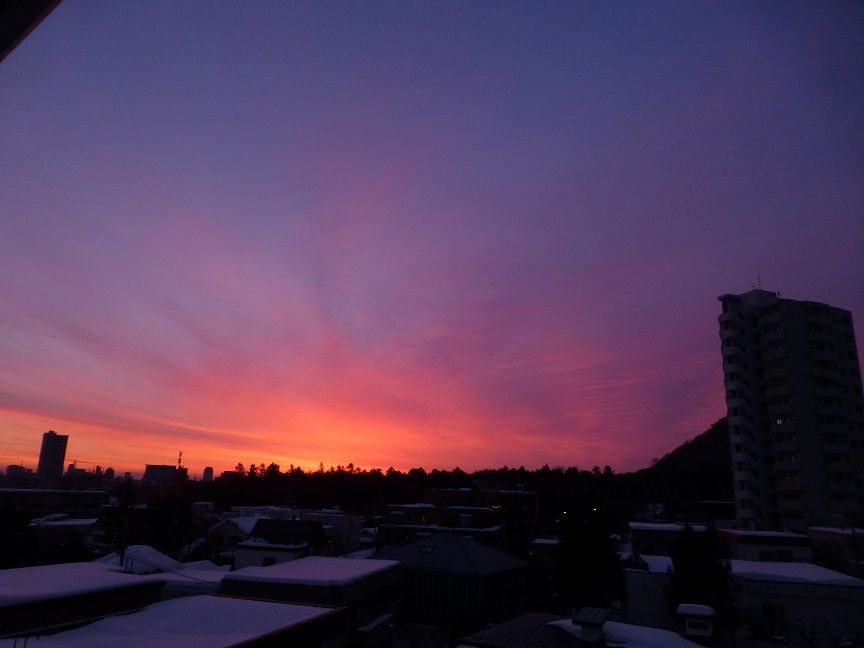 みごとな朝焼けで始まった朝。夕張岳も赤く染まる、赤富士ならぬ、赤夕張、、、。ま、いいか。朝焼けは天気が崩れるというが、気温はプラス5度、だが、曇りがちな一日になった。スーパームーンもおあづけ。ともあれ、火曜日が無事終了。だいたいこの時期が積雪量もピ―クで、気温も春の予感。