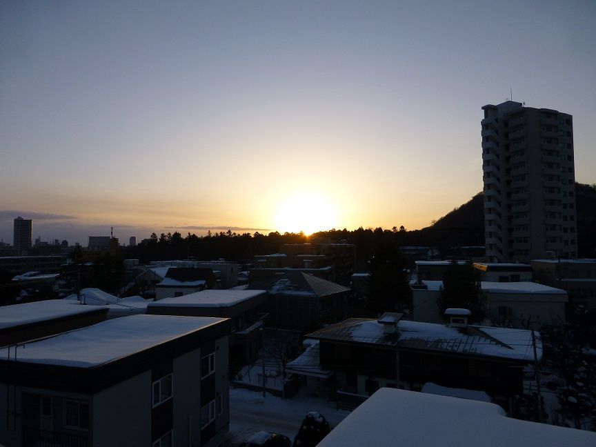 まだ日の出前だが、晴れた。冬型でもっと荒れた天気かと思っていたけど、いいほうに外れた。向いのマンションの上に金星。朝日ももう円山公園の真ん中近くに。しかし、この天気も長続きせず、やっぱり雪の一日になった。立春過ぎても、冬だね。春よ来い!