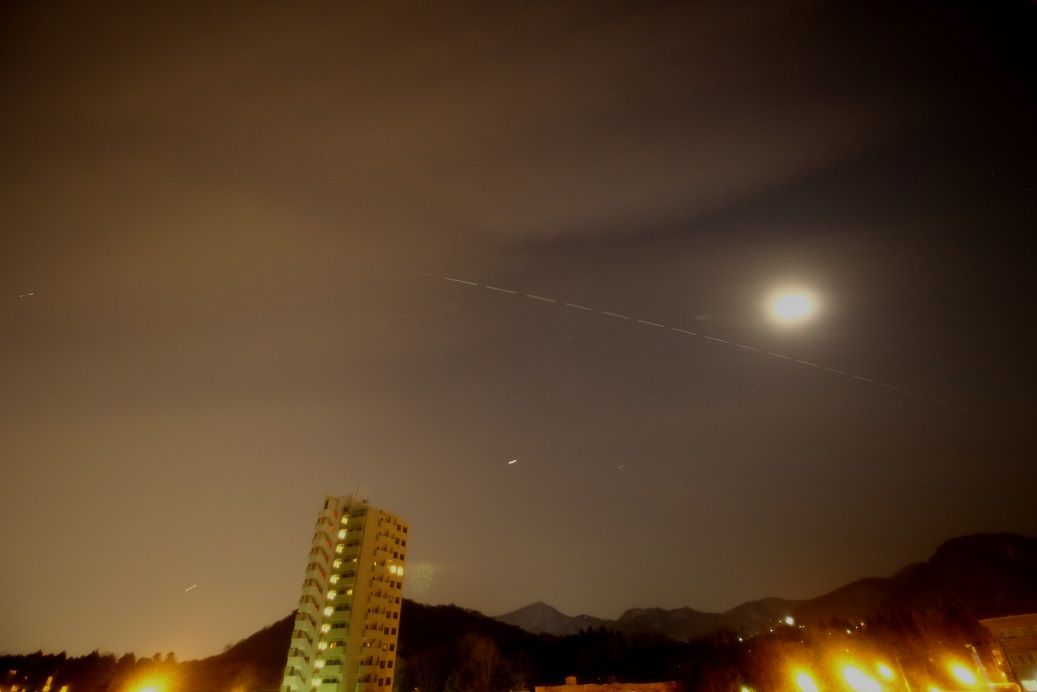 今朝5時過ぎ、久しぶりに「きぼう」にご対面。薄曇りの中、月明かりにもめげず、なんとか写真にできた。肉眼では、もっと左(東)に向かっていくのが見えたのだが、雲がやっぱり邪魔して、「明合成」では隠れてしまった。それでも、目の前、南の空を横切っていく姿を見られて、気分いい。「きぼう」が見えた、明日からハワイで楽園を見てくる。夕方の長い会議も、あんまり苦にならず、テキトーにシメ。へッへ。