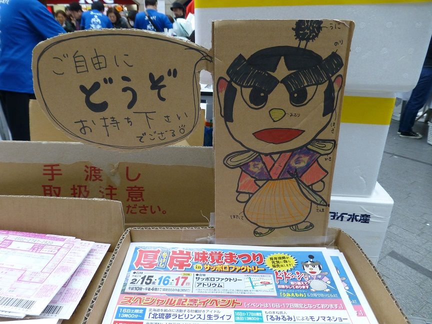 ちょんまげがウニ、耳がホッキ、鼻がアサリで、肩がカキ、はかまがホタテ、なんて誰?って感じだけど、がんばって作ったね、そのキャラ。ちょっと着る物を買いに、ファクトリーに出かけると、フロアーで何やら音楽が聞こえた。決して上手とは言えない音楽を見ると、その周りで「厚岸祭り」だった。2~3年前に、その厚岸祭りでカニを格安で買ったことを思い出し、駆け降りた。やはり、格安カニをゲット、満足。何しに行ったか、それはともかく、鼻の効くカミさんに脱帽。カニ、美味し。