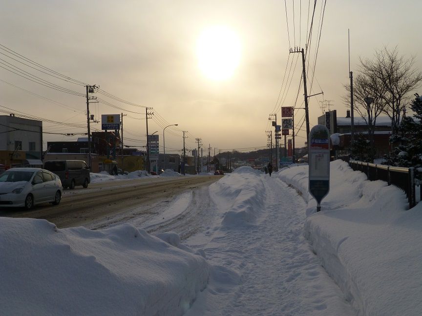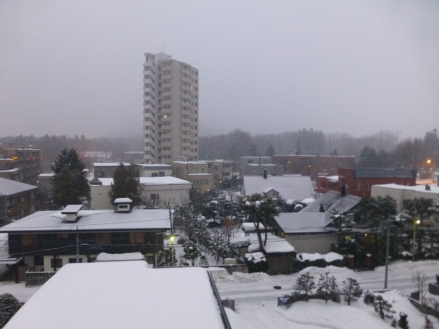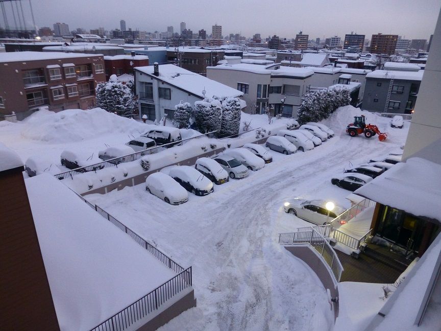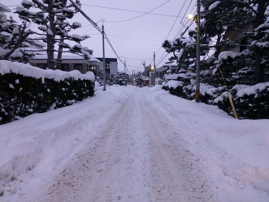 昨日からの雪、20センチほど降った。東京なら大雪だろうが、札幌なら、、、大雪ではなく、中雪?ほどか。それでも、朝から駐車場に除雪車が入った。一日中、雪降る中で、除雪作業。お疲れさん。さて、今朝はそんな雪の中を出勤。細い雪の踏みあとを辿るように歩く。向こうからおばさんが来る、、、天敵だ。早めに左に寄って、譲ろうとするが、なんと、向こうも同じ側に寄ってくる。あわてて、右側に寄ってやりすごす。あくまでマイペースを通すのだ、オバサンは。次も、左に寄る、、、おばさんはまっすぐにやってきて、無視。あくまでマイペース!雪が降ったあとの踏みあとをあるくのも大変、なのだ。ともあれ、無事に出勤すればOK!