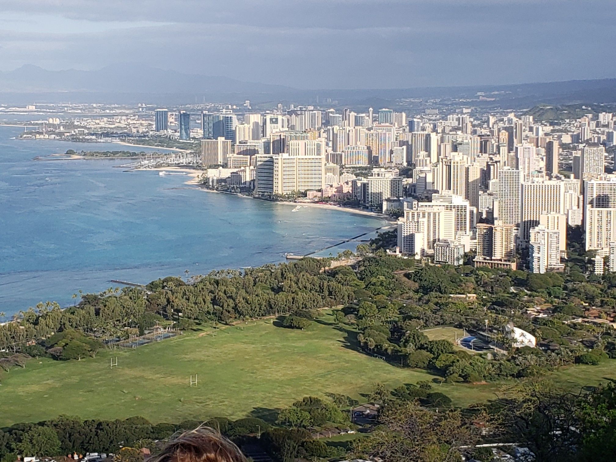 ダイアモンドヘッドからワイキキ、それと内側のカルデラ。天気に恵まれ、素晴らしい景色だった。