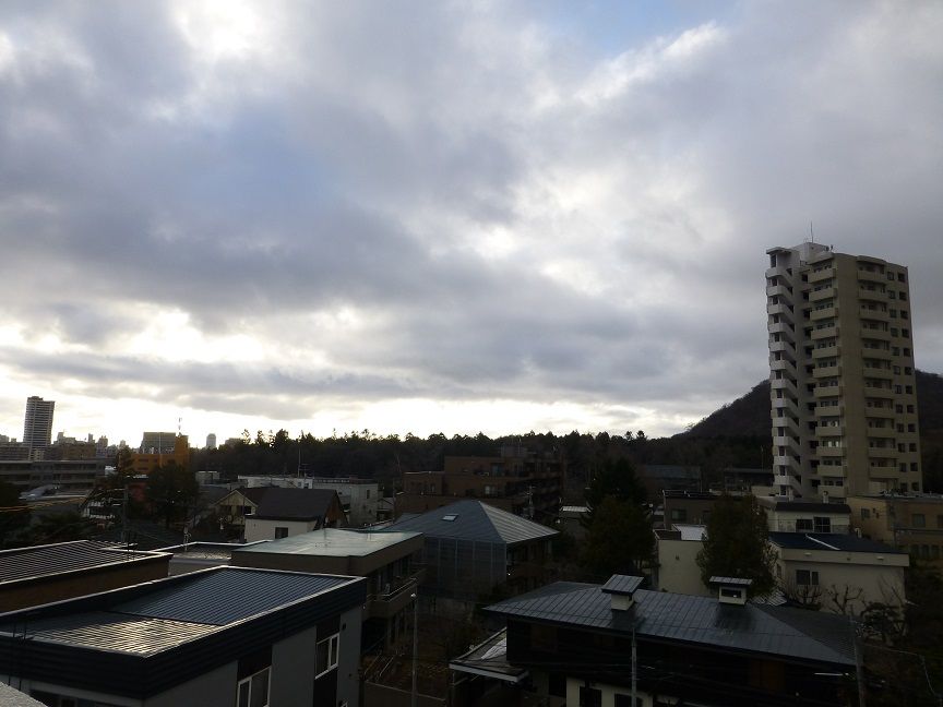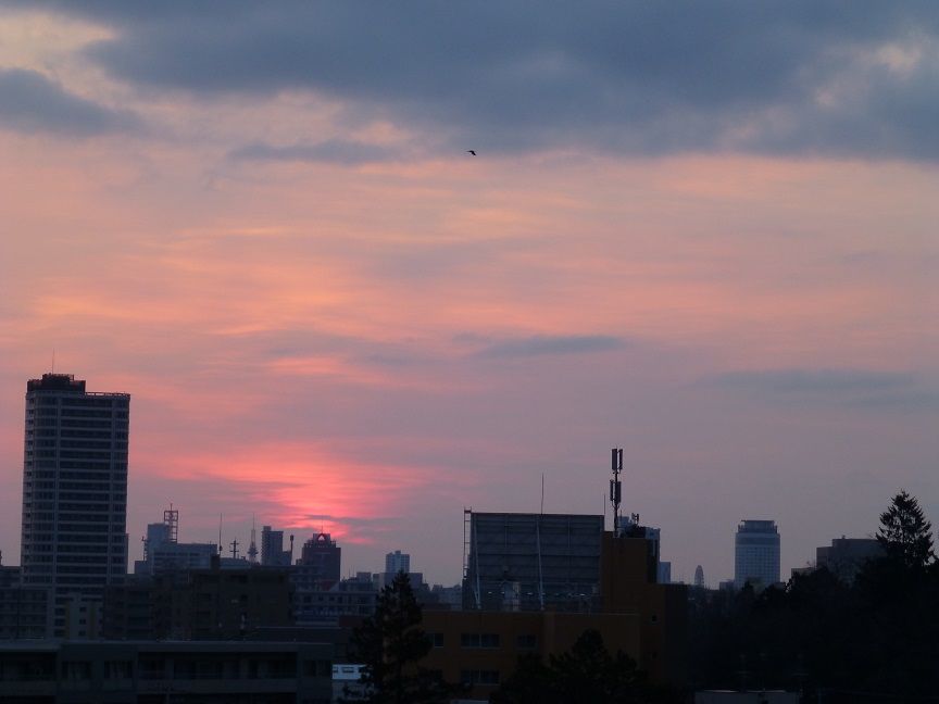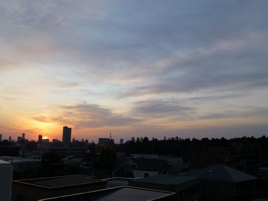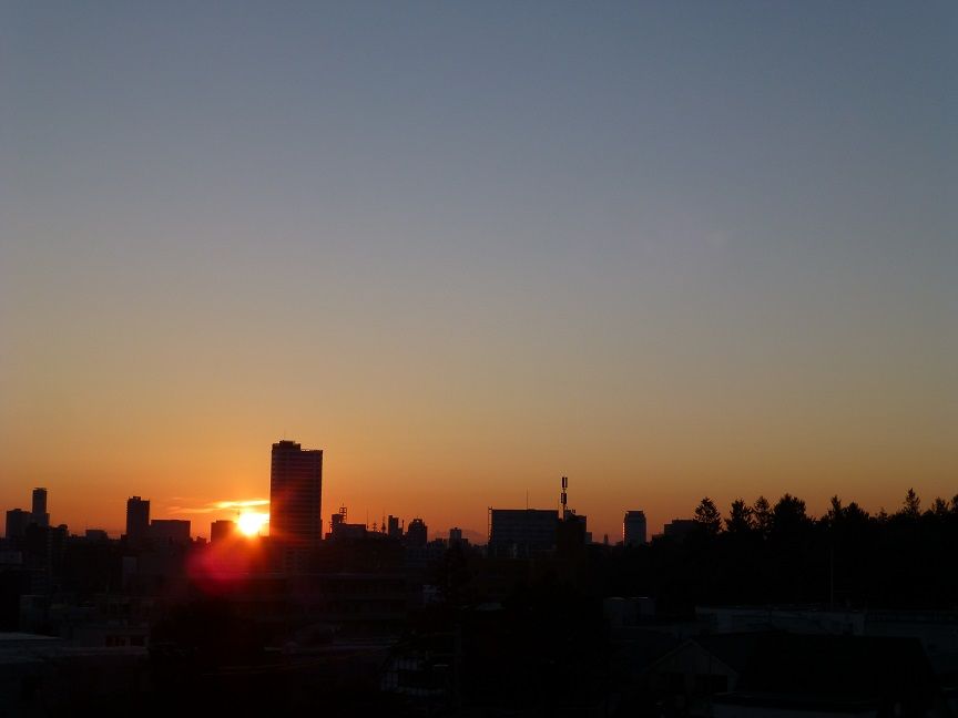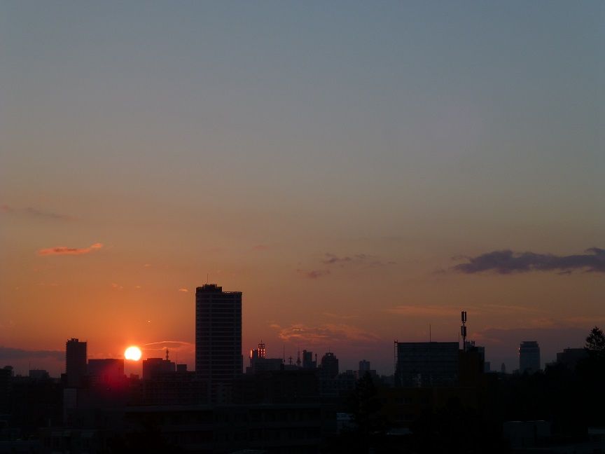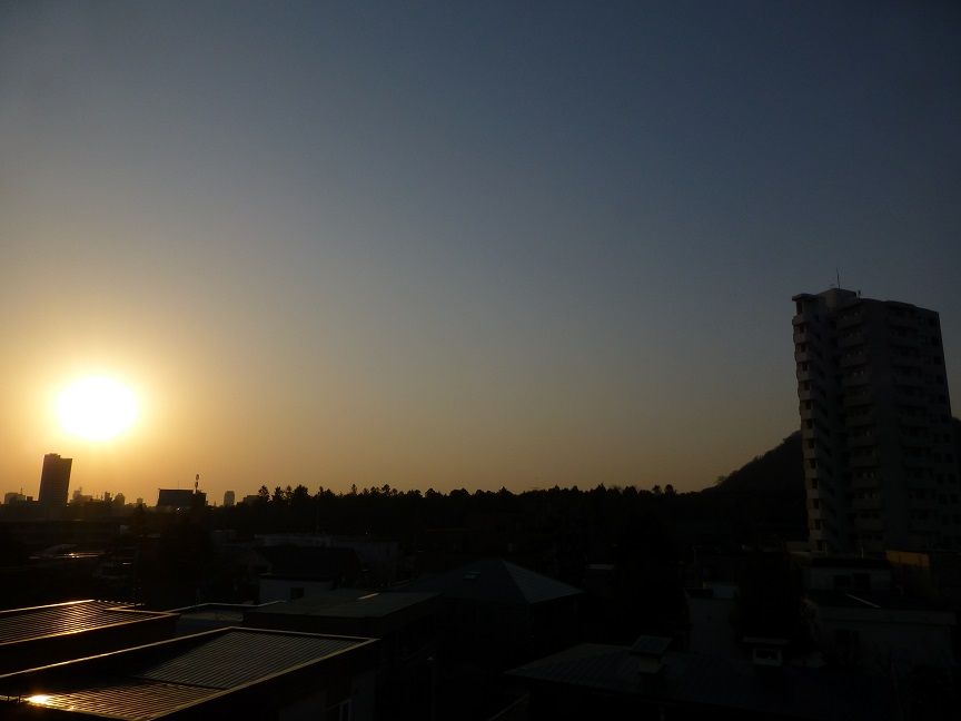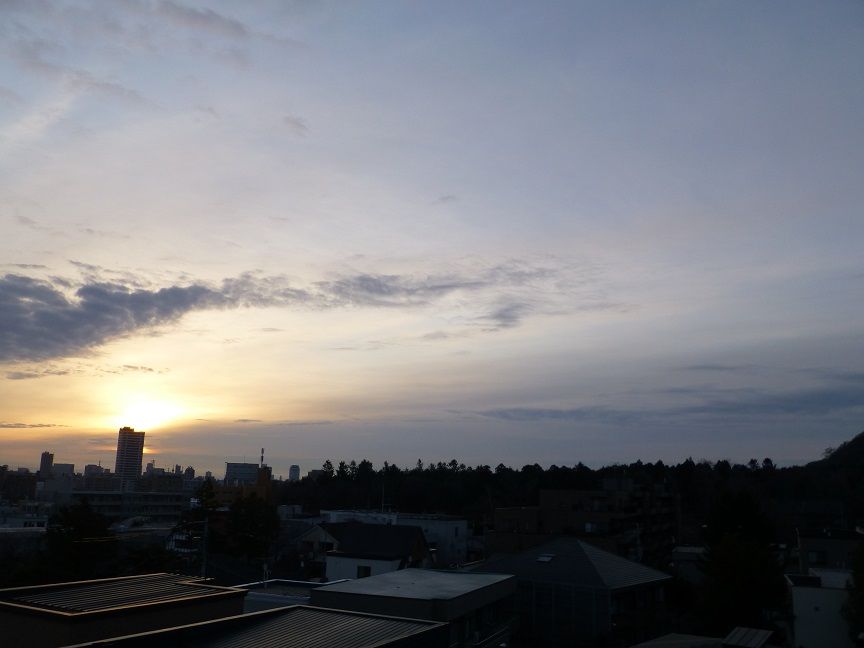 快晴の朝、なんと気持ちいい景色。教授マンションの左(北)から朝日が昇り、真東の夕張岳も浮かんで見える。スズメも青空が気持ちよさそう。一日もった天気で、夕日が病院向いのアパートの右端に落ちる。つい先日まではアパートの中央だったよね。季節の移ろいのなんと早いこと。ついに旅行まであと一週間になった、楽しみというよりうまく行くかと不安が募るね。始まってしまえば、開き直れるんだけど、山登りもそうなんだ。