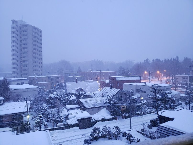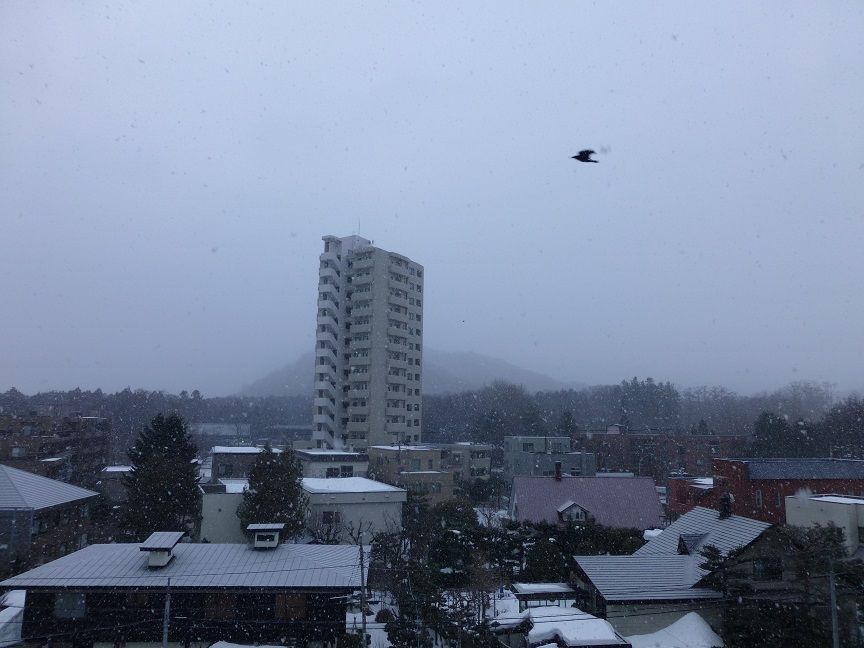 月曜日の朝、天気予報は曇りなのに、、、朝からバサバサ降り、カラスも雪に逃げ惑う。結局、一日、こんな天気が続き、帰るころにはようやく晴れたが。予報は外れだ。朝のうちは、「落ちては解ける雪を見ていた」という歌詞がリフレインしていたが、帰りには零下で、もはや解けない冬の道になっていた。ま、そんな、季節の変わり目だね。