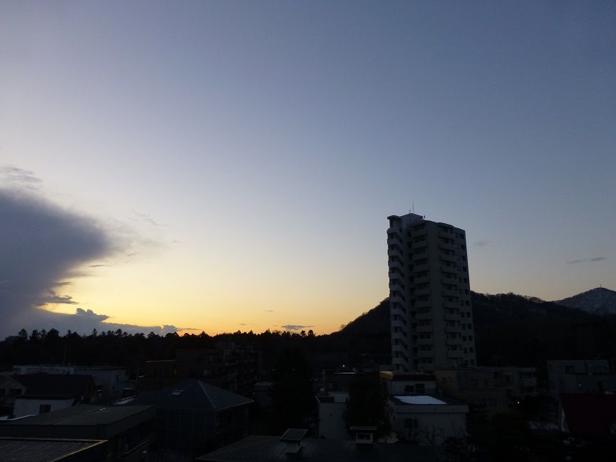 爆弾低気圧が過ぎて、10センチ近い雪で、冬景色で始まった朝。しかし、このあと、天気は回復し、晴れ間が広がった。医局から、昼にふと空を見上げると、彩雲まで登場、いい天気だね。帰り際、なんと、銭函天狗岳に沈む夕日。6年も景色を見ていて、初めて見た景色と思う。春分の日の1週間前は、銭函天狗岳に陽が沈む。大発見!5時半の帰りには、すっかり雪も解けて、まだ明るさも残り、春の夕方だね。冬で始まったけど、春を感じて終わった一日、いいね。