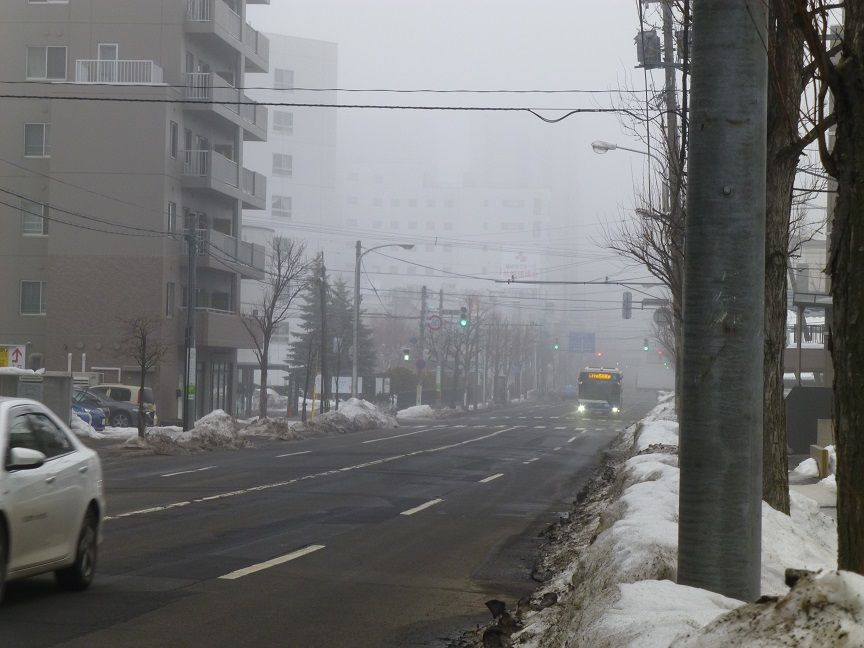 100m先がかすむ霧の朝に、バスを待つ。この湿度は、午後には雨に変わった。一気に雪解けが進み、冬を洗い流している。明日は、また冬型になるそうだが。そんな季節の変わり目。
