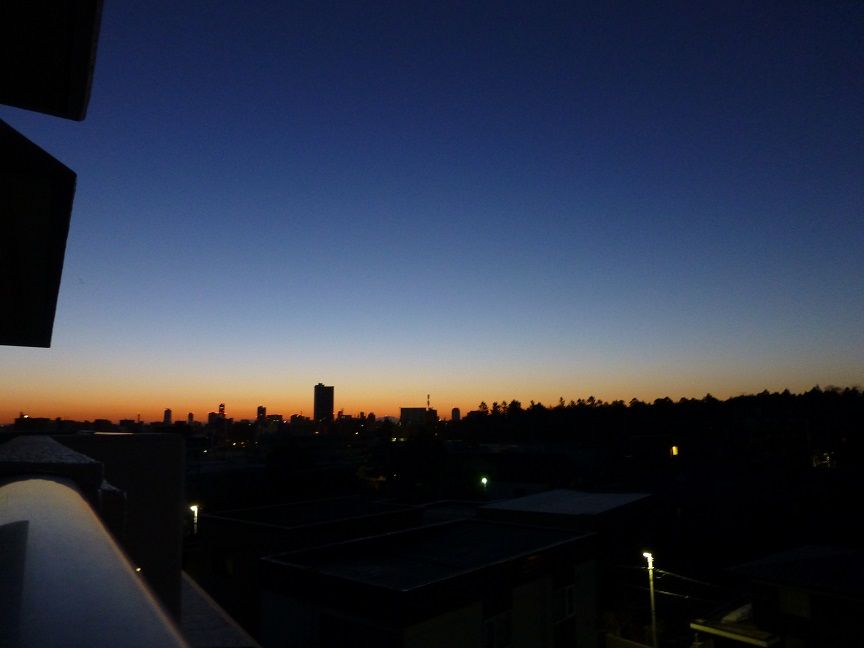 わずかに雲が残るが、夕張岳もくっきりと見える朝。いい天気になりそうだ。その天気は一日続いて、夕日は、左のアパートの後ろに沈むようになった。オリンピックの延期が決まった、仕方あるまい。天気もすっきりとした一日だった。