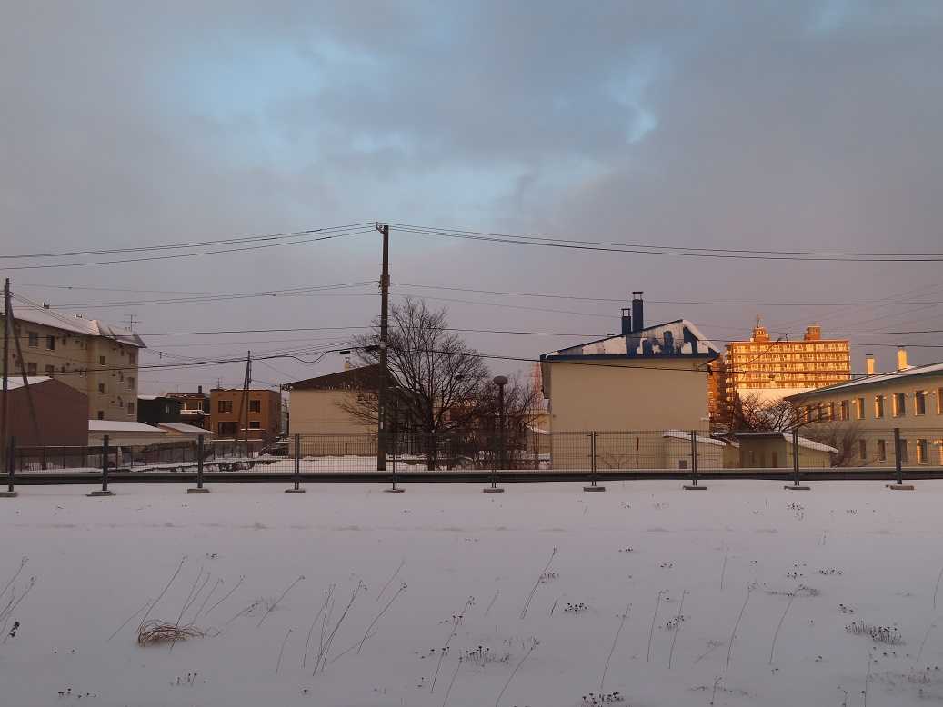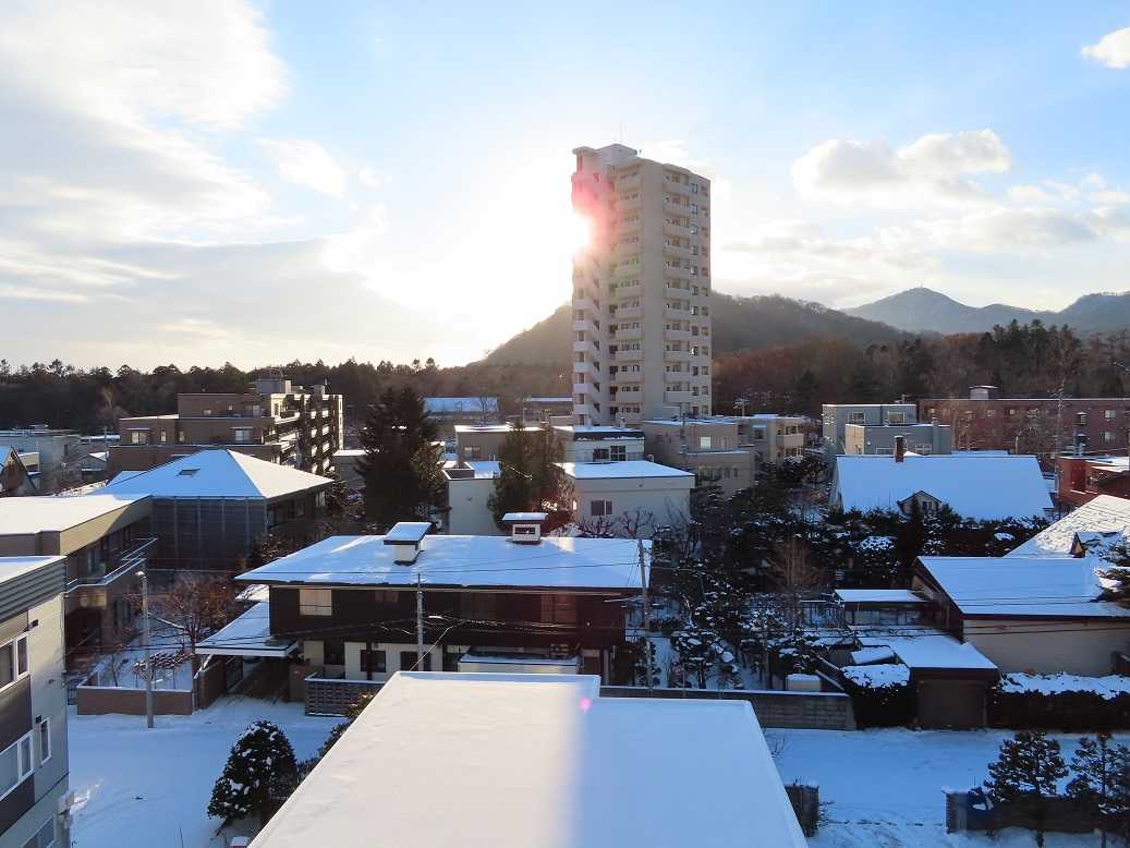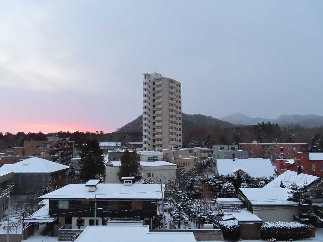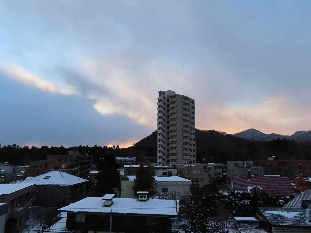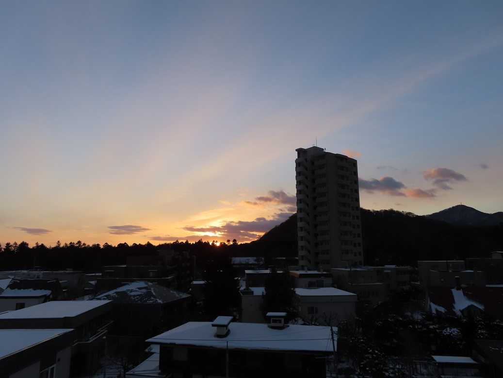 うっすらと雪が降って、今日も曇りがちな寒い朝。なんせ、最高気温がマイナス5度、って予報だ。最低気温、でなくて?かろうじて顔を出した太陽は、この時期、円山の斜面に沿って登っていく。冬至の時期の円山と太陽のコラボの景色だ。寒いを実感。昼は五○堂「タラと豚肉のカレー」温まったね。午後から、年賀状作り、どうせ外は寒いし。季節の行事の一日。