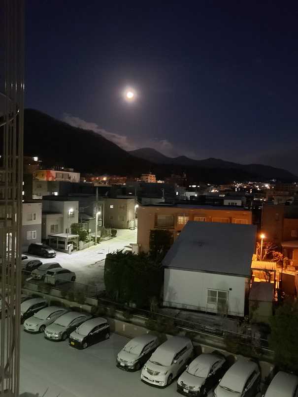 昨日の満月が、朝になっても残ってた。駐車場の雪もね、うっすらと。医局前もうっすらと雪景色だったが、昼には、また雪が待ってきた。流行語大賞は「3密」だって、、、コロナの季節の12月が始まった。