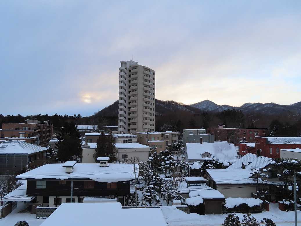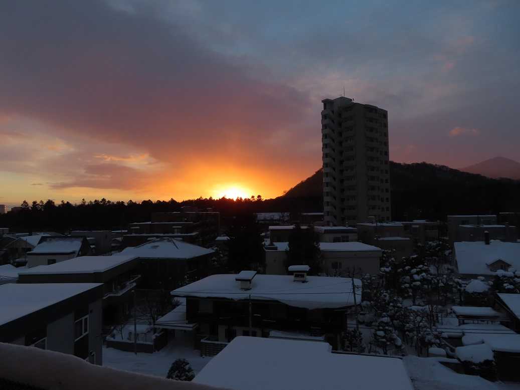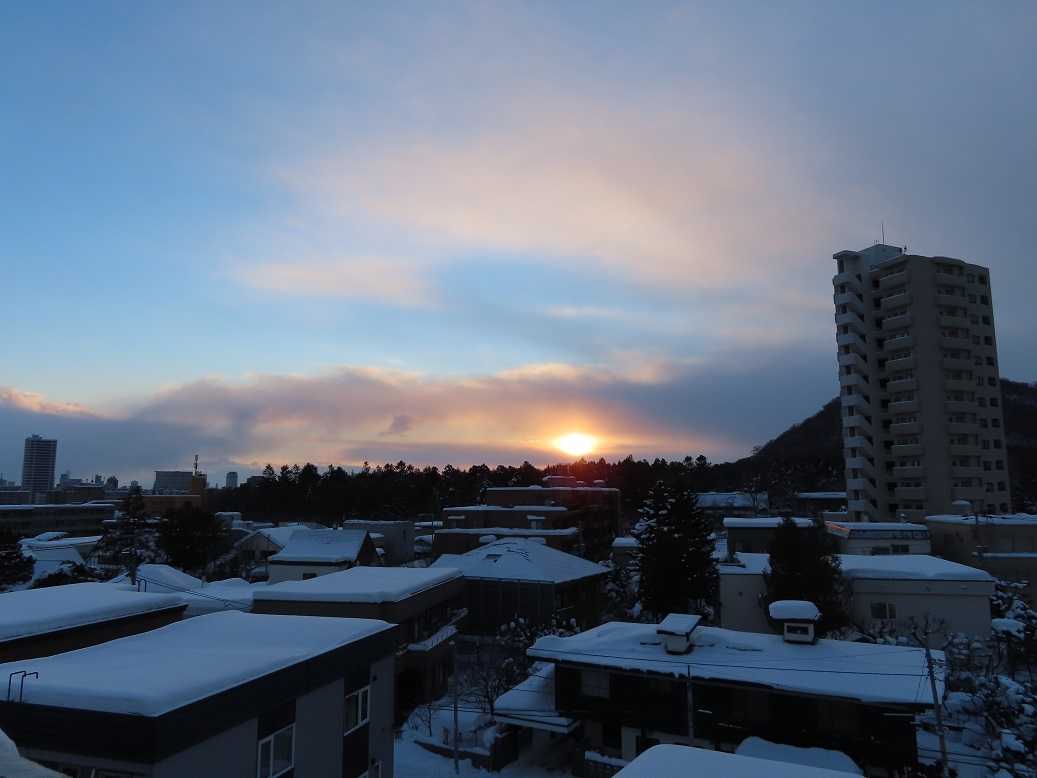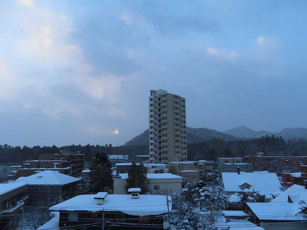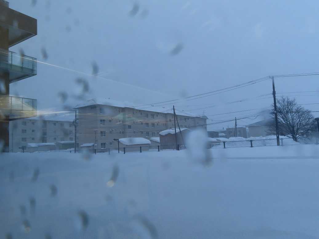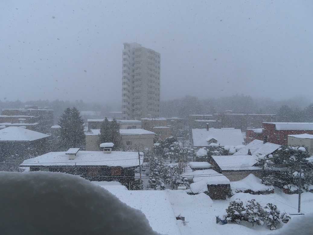 医局前の朝は、薄曇りで、5号線沿いのマンションに朝日を赤く染めた。山ならモルゲンロートか、午前中はなんとか曇りだったが、午後には、予報通りに雪が吹き荒れ初めて、湿った雪がバサバサ降ってきた。明日は、冬型になって、もっと荒れるらしい。ま、北海道の真冬の景色。