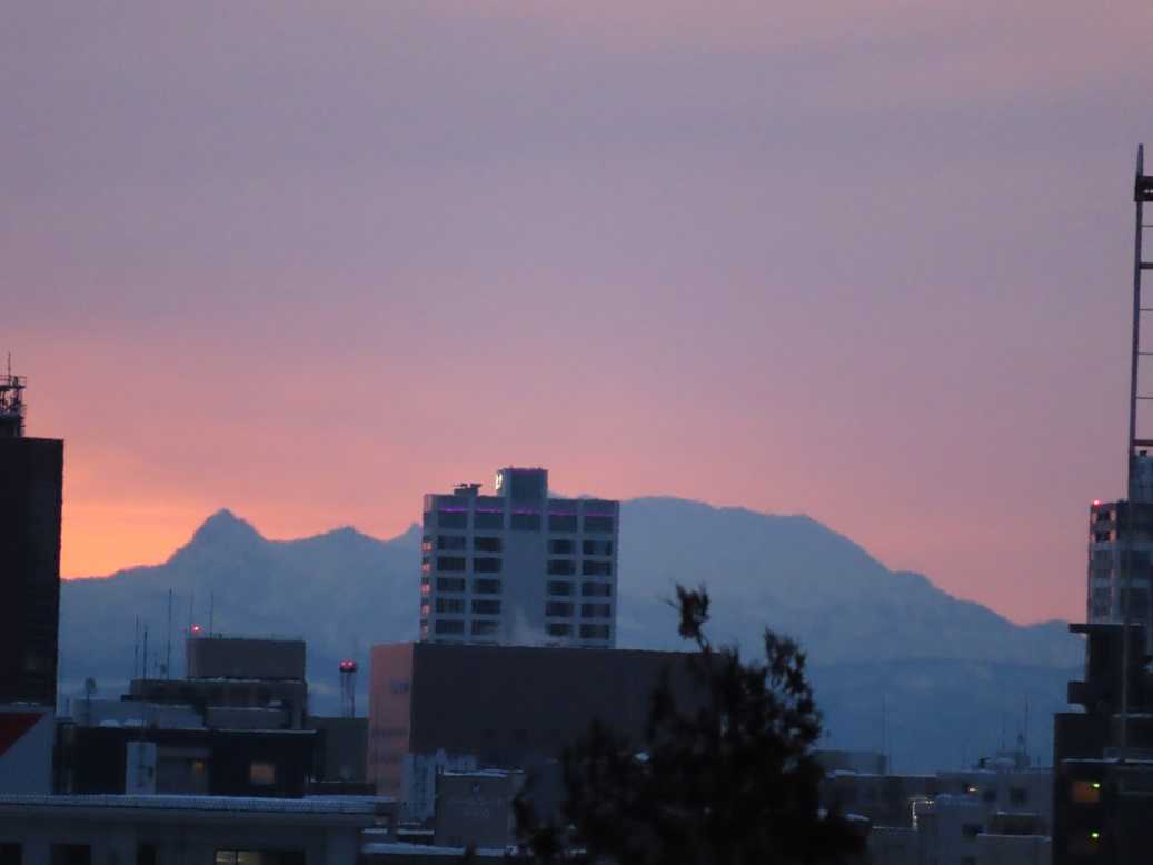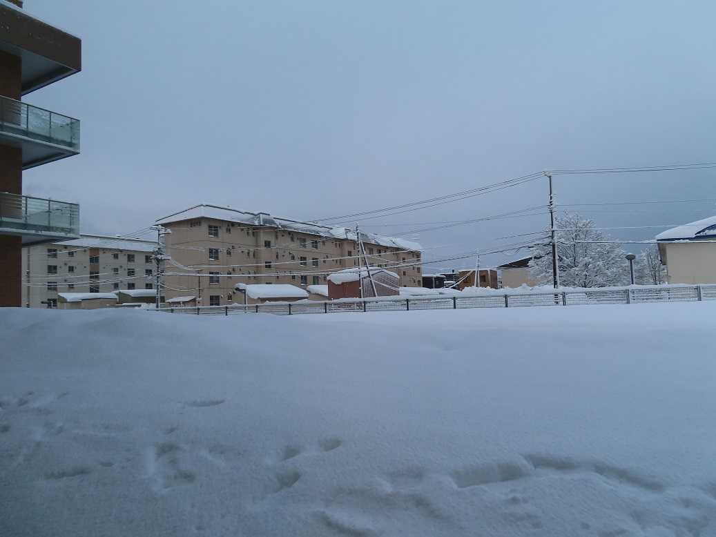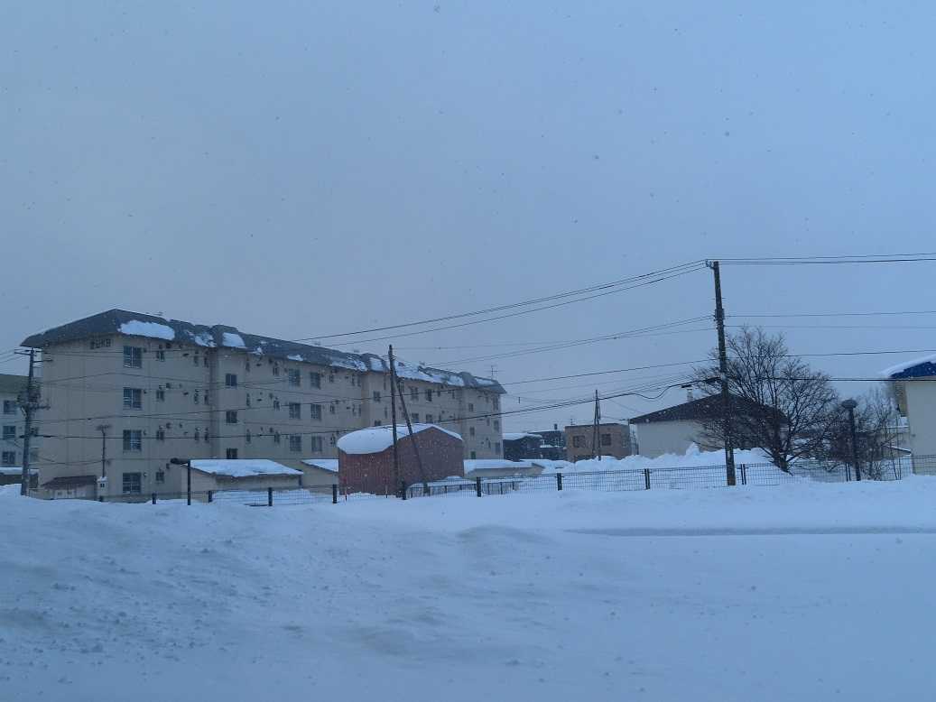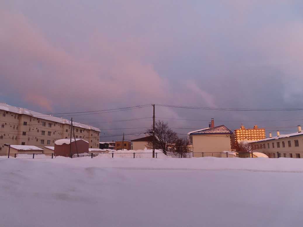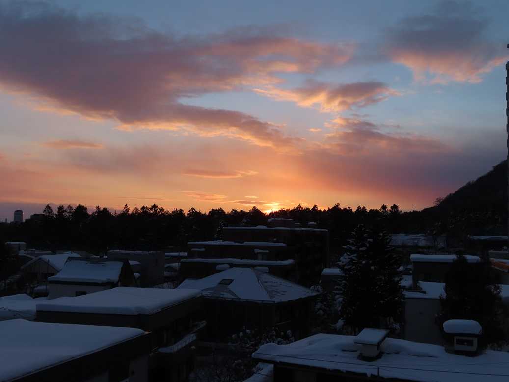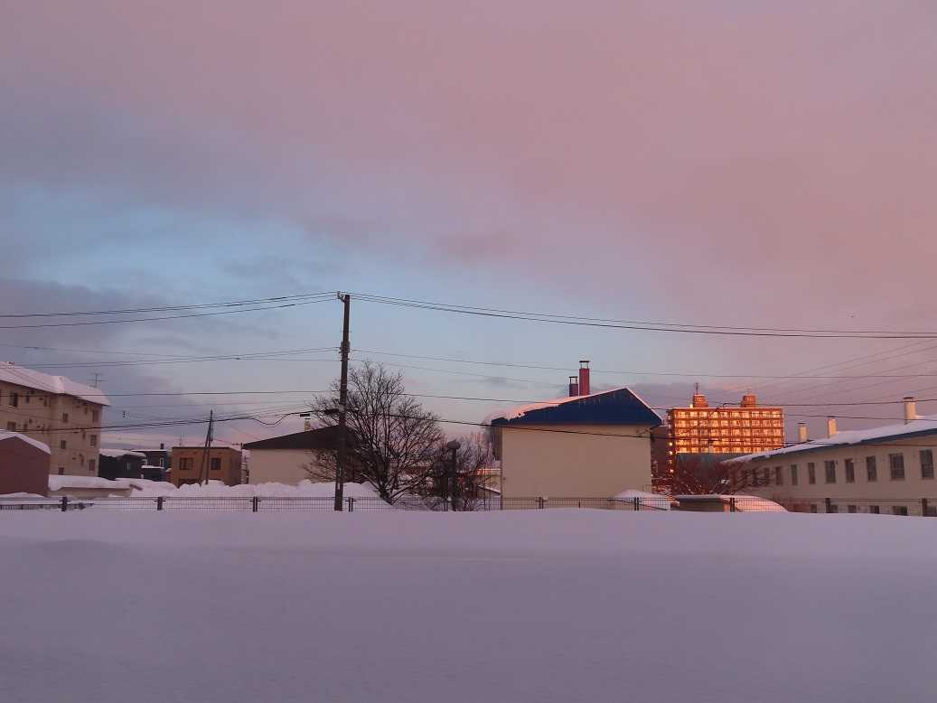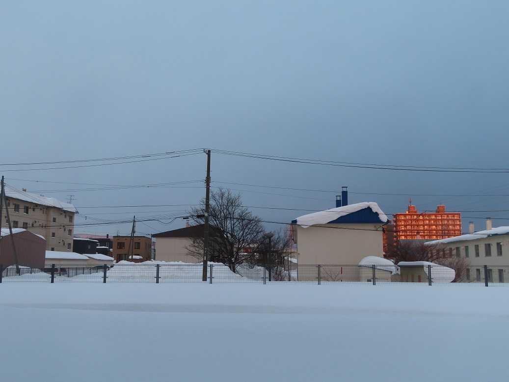 医局前の朝は、薄曇りで、5号線沿いのマンションに朝日を赤く染めた。山ならモルゲンロートか、午前中はなんとか曇りだったが、午後には、予報通りに雪が吹き荒れ初めて、湿った雪がバサバサ降ってきた。明日は、冬型になって、もっと荒れるらしい。ま、北海道の真冬の景色。