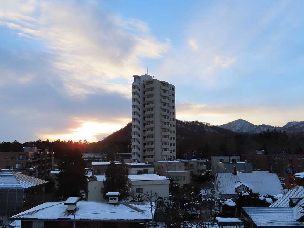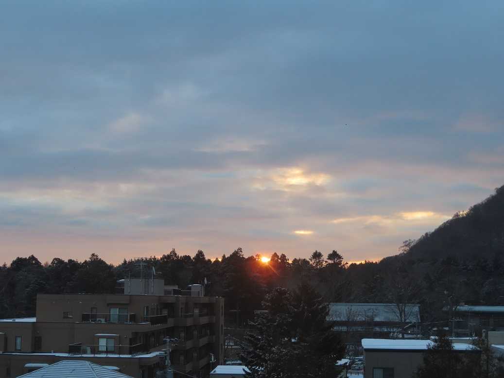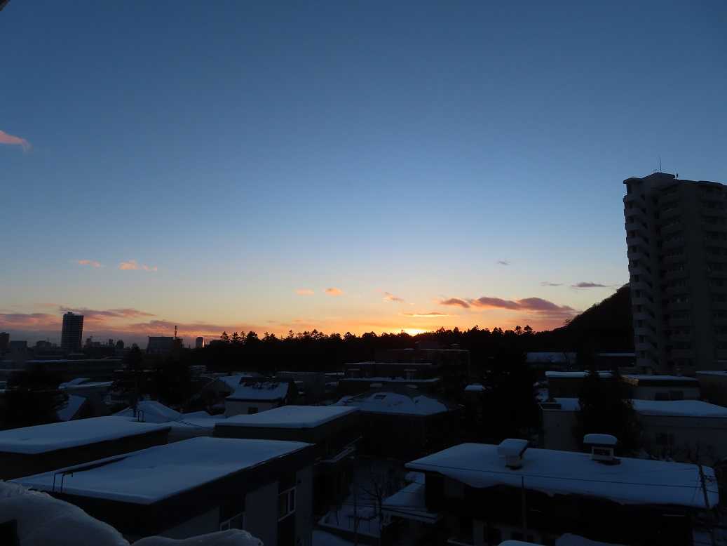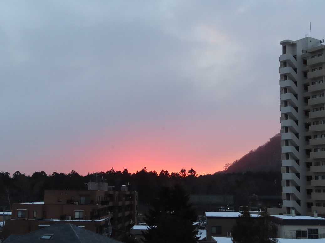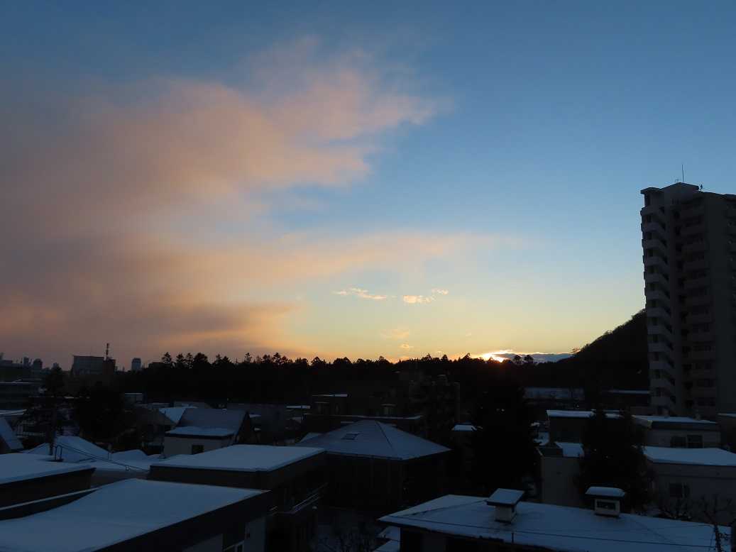快晴の朝で、グラデーションも見事だ。夕張岳もくっきりと。しかし、天気のいい分、放射冷却で、ー13度、寒い。とにかく、気を取り直して、月曜日、出勤するしかない。バスの運転手が足りなくて、乗り継ぎにつかっていたバスは運休だと。歩くしかない、月曜日。