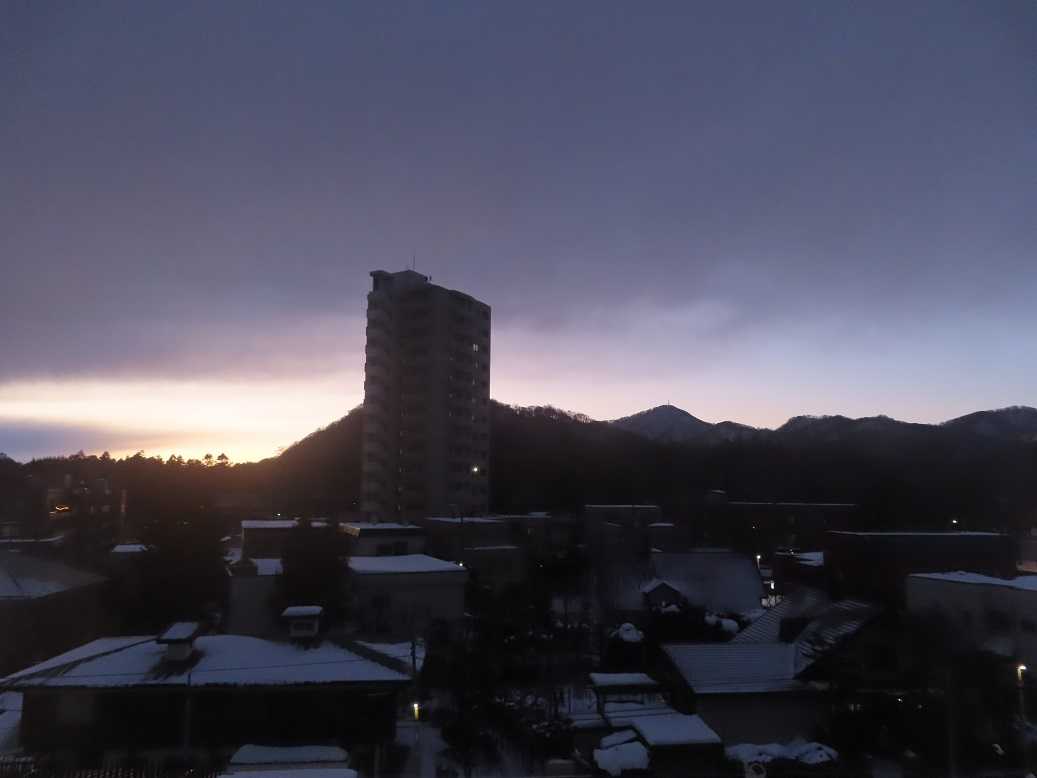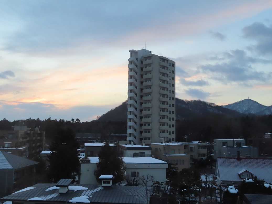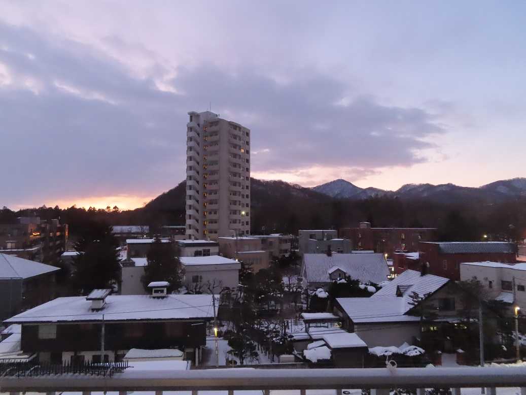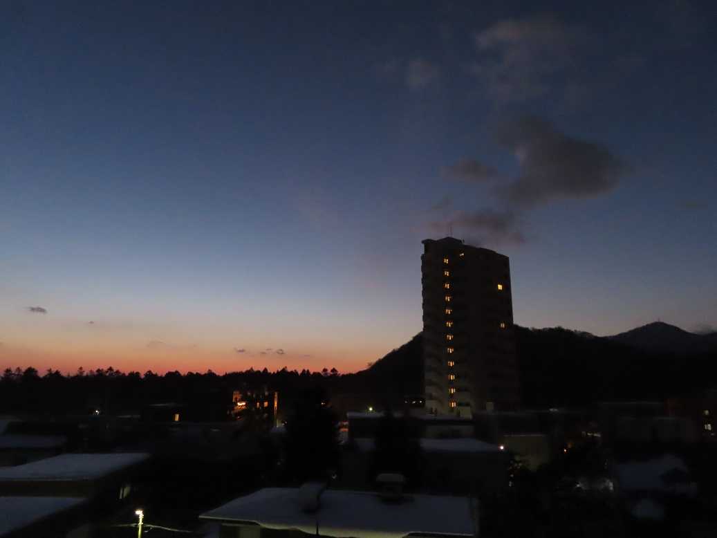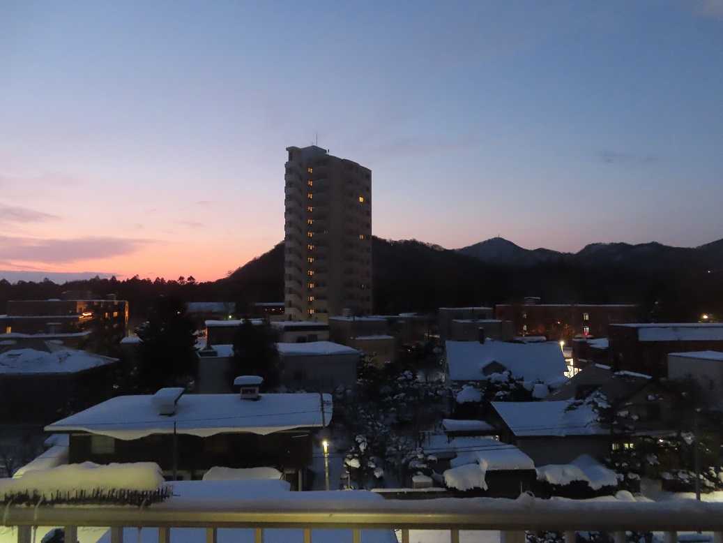 快晴の朝で、グラデーションも見事だ。夕張岳もくっきりと。しかし、天気のいい分、放射冷却で、ー13度、寒い。とにかく、気を取り直して、月曜日、出勤するしかない。バスの運転手が足りなくて、乗り継ぎにつかっていたバスは運休だと。歩くしかない、月曜日。