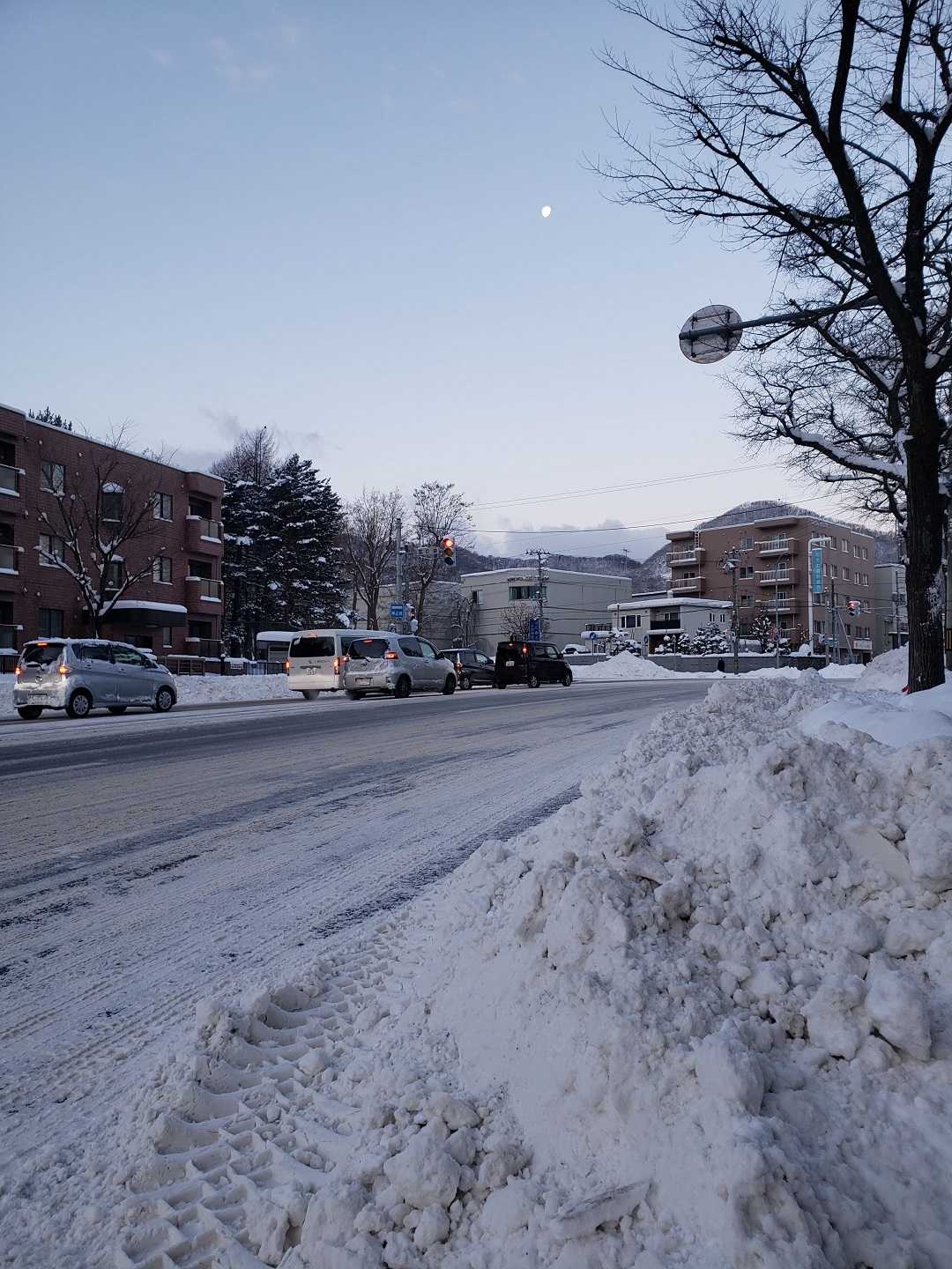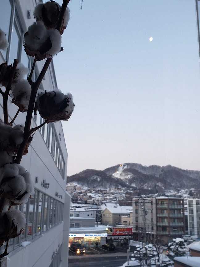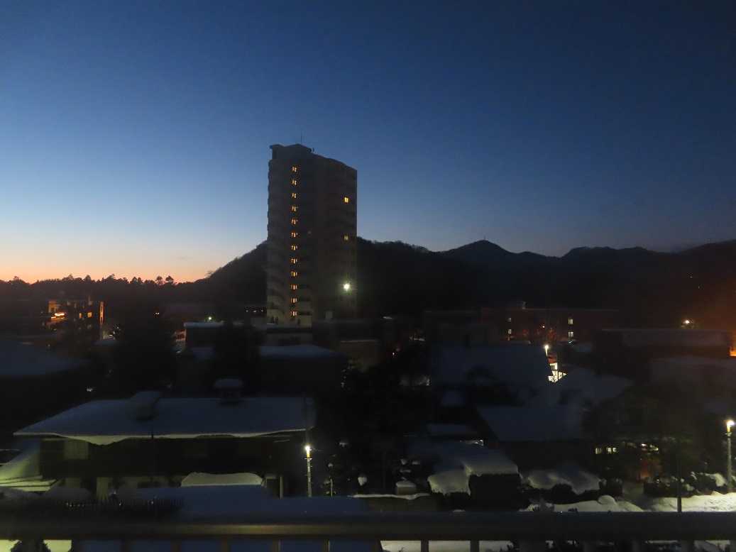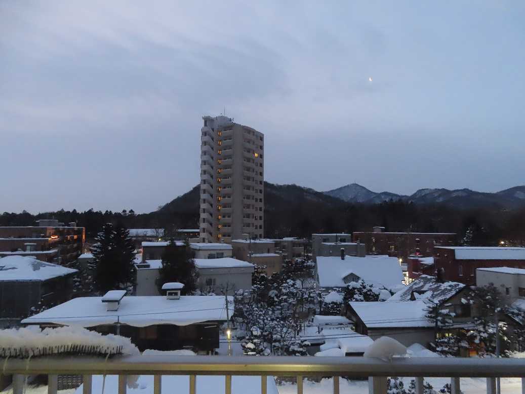 出勤のバス停、午前7時過ぎ。明るい、白い景色。帰りのバス停、午後5時半近く。月が見えるが、うっすらと青い空になった。今日は7時前の日の出、5時15分前ほどの日没。ずいぶんと日が長くなった実感があるね。あとはどんどん明るくなるのを待つだけ、春よ早く来い、って。今晩は10年に一度というシベリアの寒気がやってくるんだと、天気は真冬のまま。