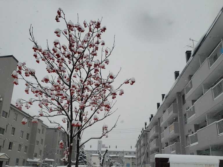 通勤バスからの雪ののったナナカマド。今朝までに20㎝ちかく降った。今日は今季最大級の雪となると、たしかに、結局30㎝ほどの積雪となった。ま、110番するほどではない、、、ムダな110番が多いというが。