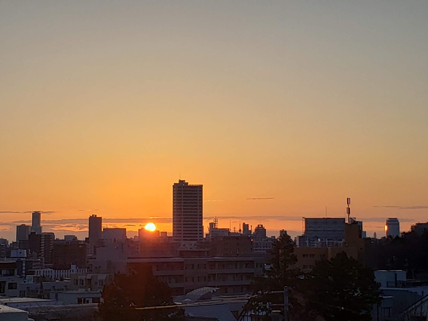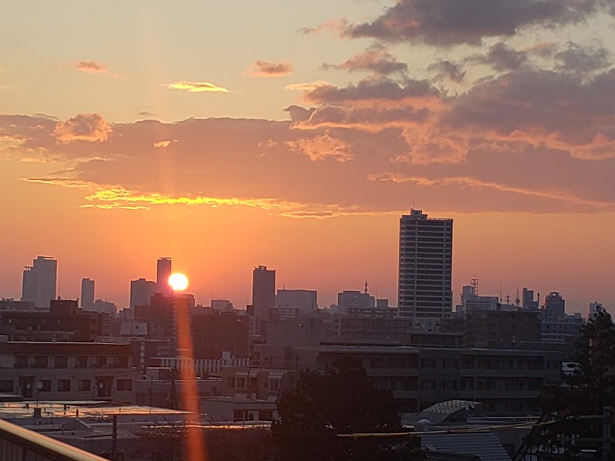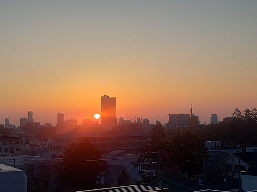 教授マンションの後ろからの日の出、久しぶり二日前に見たばかりなのに、雪解けが進んでいる雪解け水が、さらにあふれんばかりに増えた発寒川ひと汗かいて、出勤いいね、歩きが楽しい季節になった