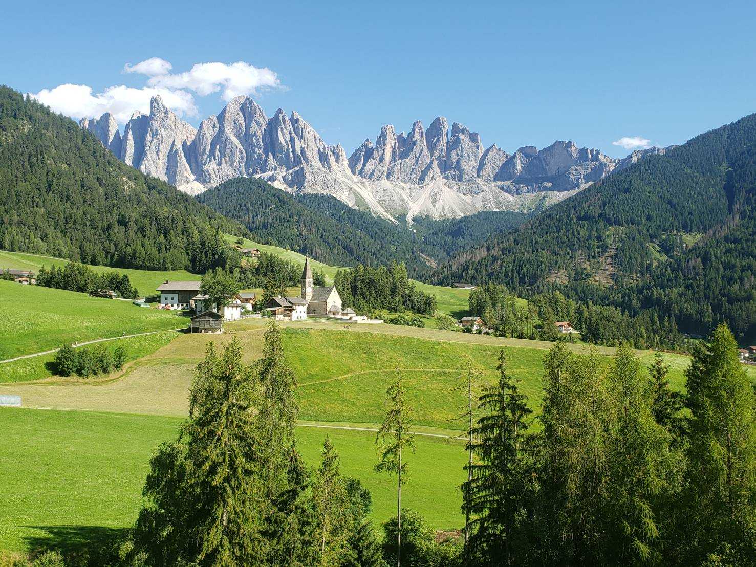サンタマッダレーナ村の景色、ここまで、汗だくでハイキング、やっぱりリアルな景色は素晴らしい。フェイクニュースを見分ける、という話が出るけど、やっぱり自分の目で、リアルなモノを見る経験を重ねる事が、基本だとあらためて思う後ろの山は、ガイスラー山、本物です