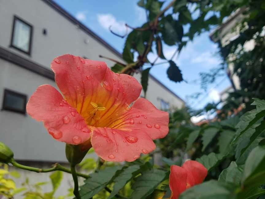 朝、雨上がりで出勤、バス停へ今日は不安定な天気でチャリはあきらめたノウゼンカズラにも雨の水滴が午後からは少し天気が良くなる予報が、土砂降りの雨がま、そんな季節なんだ