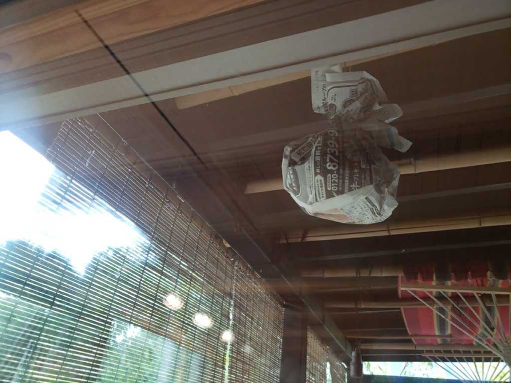 天井から、新聞を丸めてぶら下げると、既にほかのハチのテリトリーと思って予防効果があるんだと