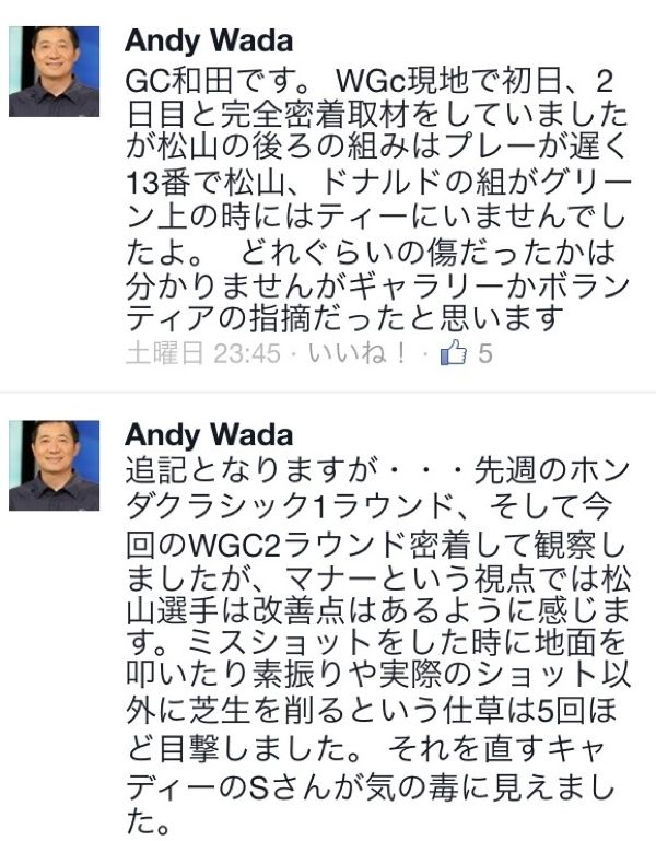 松山、グリーンたたき物議 「愚か者」非難 男子ゴルフ (2014年3月9日19時16分) http://www.asahi.com/articles/ASG393443G39UTQP008.html まずは、↑↑↑こちらの記事を読んでください! 一体、松山くんに何があったの?と、私もよく理解していなかったのですが、読んだらスッキリしました。(笑) とっても簡単に説明をすると、キャデラック選手権の第2ラウンドでの出来事。13番パー3を、2パットでボギーにした松山くんが、いらだってパターでグリーンをたたいたのだそうです。それを、後ろのイアン・ポールターが見ていて、さらにプレー終了後にツイッターで「松山がカップから1・5メートルのところをたたき、へこませた。彼が直さなかったから、競技委員が直した。愚か者だ」と非難したのだそうです。しかも、その翌日に松山くんはイアン・ポールターと同じ組になる。そのことがメディアの注目を集めたというわけです。 松山くんは翌朝、イアン・ポールターに謝罪し、ポールターもそれを受け入れことなきを得た、ということらしいです。 松山くんのコメントは「グリーンが傷つくほどやったつもりはなかった」と釈明した上で、「厳しいコース設定の中、我慢が足りず未熟だった。マナーがなっていないということ。反省したい」。 他の記事を読むと、後続組の選手のライン上に松山くんが叩いた凹みがあり、競技委員が修復した…とあるのですが、、 ここで私はすごく疑問に思うことがあります。スパイクの傷も直せないグリーンが、前の組が作った凹みは直せるのか?ということ。故意に付けられた凹みだからでしょうか?まだ詳しくルールブックや裁定集で調べていないのでなんとも言えませんが、あるがままじゃないのー?っていうのが最初に思った疑問。スパイク傷だって、直せないからこそ、ちゃんと修復して次の組にグリーンを開けるじゃないですか。だったら、パターで叩いた作った凹みだって、そのままでプレーするんじゃないの?ホールアウトしてから直すんじゃないの?って、すみません。ルールブックで確認してないのになんかスッキリしない感じ。でもゴルフルールは「フェア」であること、を常に謳っているので、修復もありなのかしら?と思ってみたり。 (追記) 日本のルールの神様!マイク青木さんのコメントを見つけました。 「今回の松山英樹の件ですが、私は、どちらの肩をもつつもりもありません。ただ、グリーン面を損傷しながら、修理しないで立ち去ることは「ゴルフをプレーする資格なし」と思っています。「ボールマーク」「スパイクマーク」は勿論のこと、パターで傷をつけた場合は、必ず直してからグリーンを立ち去るべきです。ルール上、パットの線上にある不整箇所でプレーヤーが修理できるのは、「ボールマーク」と「古いホールの埋め跡」だけです。したがって、スパイクマークやパターで損傷させた部分は「必ず」修理して立ち去らなければなりません。でないと、後続組のプレーヤーの誰かがいいパットをしたのに悪影響を受けるという貧乏神を引くことになりかねないからです。イアン・ポルターは、自分のことというよりも、松山以外の他のプレーヤーが迷惑を蒙る可能性を秘めたこのような行為は絶対にしてはならない、と至極当たり前のことを少し強い調子でツイートしたまでです。」 うーん。やっぱりとてもわかりやすい解説ですね!でもまだスッキリしないのは競技委員がグリーンを修復したのはどのタイミングなのか?あちこちの記事を調べてみようーーー。だって、そこが一番肝心なのに、ちゃんと書いてない記事が多くて、松山くんとイアン・ポールターのことばかり!もうーーー。 見つけましたー。スポニチの記事です! http://www.sponichi.co.jp/sports/news/2014/03/09/kiji/K20140309007740770.html これを読むとやはり、「修復のために審判を呼ばなければならなかった」とあるので、グリーンに行ってから凹みが問題になったようです。 「松山が13番のパットを外した際に、クラブでグリーンを傷つけ、2センチほどの傷を付けてしまった。無意識だったため放置してしまったことをポールターが気付き、「なぜ、クレーターをそのままにしたのか。修復のために審判を呼ばなければならなかった。愚か者だ」と160万のフォロワーに向けてツイート。事実が白日の下にさらされ、全米でも大きく報じられた。パットグリーンの傷が後続のシャール・シュワーツェル(南アフリカ)のパットラインに影響を及ぼしたため、ポールターは重く見たようだ。」 パットのラインに影響を及ぼしたため、って、そりゃあ凹みは影響を及ぼしますよね。でも、なんでそれを修復できるのかが、私には疑問! そして、さらにアンディー和田さんとうメディア関係の方のコメントを見つけました。(←公開コメントなので本人の了承を得ずに掲載させて頂きますがNGのときはご連絡ください。)これまたびっくり!松山くんの後ろの組はプレーが遅くてティにいなかった発言。イアン・ポールターが見てたんじゃ