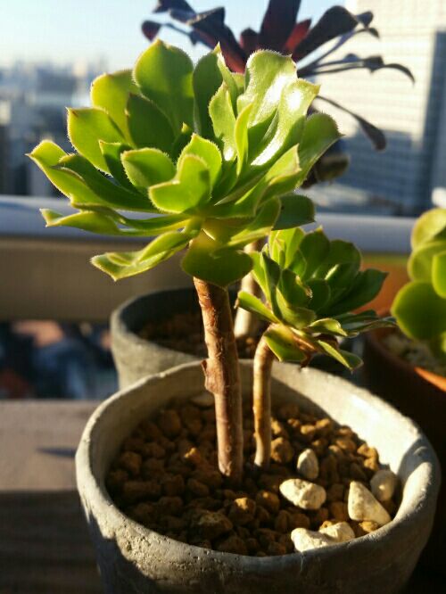 12月28日に記事にしたアロマティカス。 この日からベランダと室内で育てている。 あれから約2ヶ月。 どうなったか見てみよう。 アロマティカスA。 撮影は室内だが外で育てている。 ベランダ最前列でタップリ陽を浴びる。 水は2~3週に1回。 アロマティカスB。 室内で育てている。 外には一切出していない。 窓越しの光もほとんど当たらない場所。 温度は最低12℃はある。 水は2~3週に1回。 Aはやや色が薄い。 下葉も枯れ枯れだ。 Bは色も濃く、下葉もしっかりしている。 寄ってみよう。 A。 下葉は枯れ落ち、黄色くなり枯れそうな葉も多数。 B。 多少黄色くなっている葉も見られるが、全体的にしっかりしている。 更に寄ってみよう。 A。 葉の色が薄く元気そうには見えない。 やはり寒いのか。 B。 やはりBの方が色が濃く健康そうだ。 結論。 アロマティカスは冬は室内が良い。 外だと寒さで葉が枯れ、黄色くなる。 室内でも明るければ徒長もしないし、色も濃いグリーンを維持する。 ただし、ベランダでも寒さで枯れ死するということはない。 まあ、2ヶ月だけでの比較だが、間違ってはいないだろう。 Aはこのまま春までベランダで頑張ってもらう。 コイツら触るといい香りがするんだよね。 アロマティカスっていうぐらいだからね。 ハーブ多肉というのも、なかなかいいもんだ。 にほんブログ村