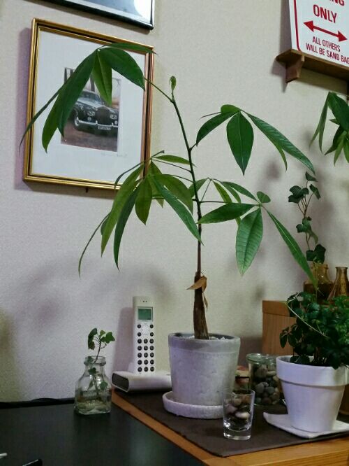 いつも楽しみに拝見しているブログに先日カッコいいパキラが紹介されていた。 洒落た鉢からシューっと伸びた幹。 そして上の方にのみ葉を茂らせる。 う~ん、やっぱりコレが理想形だな。 うちにもパキラが2鉢。 真冬の今、どうなっているのか、早速見てみよう。 デカイ方。 茎はシューっと伸びているが、葉は中ほど辺りに密生。 上と下はまばらだ。 う~ん。 何かカッコ悪いなあ。 しかも下葉が枯れていき、中ほどの葉まで枯れかかっているのだ。 この、一番上の葉と2番目の葉は大丈夫なのだが、3番目の葉はこんなだ。 左3つの葉の先端から黄色くなりかけている。 こうなるともうダメ。 いずれ茶色くなって枯れる。 4番目の葉も同じ。 5番目になると一部が枯れ落ちて、こんな具合だ。 このパキラ、大丈夫か? 一方小さい方。 葉焼けした部分もあるが、こっちは下葉が枯れることもなく、葉は繁っている。 コイツは茎が2本ということもあり葉の数も多い。 問題無さそうだ。 コイツらも買ったときは小さかった。 デカイ方は一昨年7月購入。 2.5号ぐらいの鉢。 現在は4号鉢だ。 小さい方は一昨年3月購入。 これも2.5号ぐらいの鉢。 現在は3.5号。 今では両方とも鉢が小さく見える。 春にはひとまわり大きい鉢に植え替えよう。 パキラ。 室内中ほど、窓から4メートルほどの位置に置いている。 窓越しの光も当たらない場所だが、南向きのため明るい。 たまに水やり後窓際に移動し、窓越しの陽に当てているが、一度葉焼けさせてしまった。 小さい方の葉焼けがそれだ。 水は今の時期かなり間隔を開けており、デカイ方で2週に1回、小さい方は10日に1回程度。 葉水はほぼ毎朝。 デカイ方のパキラが寒いのに新芽を出している。 下葉は枯れるのに、新芽は出す。 調子が良いのか悪いのか? どうなっているんだろう。 今のところこんな状態のうちのパキラだが、2メートルを目指すのだ。 そしてカッコいい鉢に入れ、幹はシューっとして上の方に葉を繁らせる…という姿にしたいのだ。 パキラよ、カッコよくなれよ。 にほんブログ村