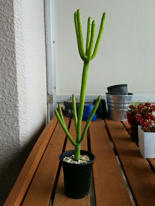 夏型多肉ユーフォルビア。 色々な方のブログでは休眠からさめ動き出した記事が上がってきているが、うちのヤツらはさっぱりだ。 動かないので面白くないが、現在の様子を記しておく。 まずはレウコデンドロン。 明らかに鉢が小さい。 周りを他の鉢で固定しておかないと、ちょっと風が吹いただけで倒れる。 一回り大きい鉢に植え替えなくては。 ちょろっと葉は出ているのだが全然生長しない。 峨眉山。 天辺から多少葉が出たような気がするが定かではない。 生長は極めてゆっくり。 稚児キリン。 ポコポコ仔吹く面白いヤツ。 最初は真ん中の棒が1本だけだったのだ。 バリダ。 コイツもそろそろ植え替えだ。 池袋屋上出身のエリート。 順調に生育した。 ホリダ。 同じく池袋屋上出身。 これも順調に生育。 池袋屋上の多肉はコンディションがいいのだろう。 そういえばレウコデンドロンも池袋だった。 紅彩閣。 トゲがまた黒くなった。 トゲが赤いとカッコいいのだが、このトゲ、赤くなったり黒くなったりを繰り返す。 新トゲは赤く、古くなると黒くなる。 ホワイトゴースト。 コイツは夏しか生長しない。 7、8月だけだ。 あとの10ヶ月は変化がない。 当然今も休眠中。 去年挿した茎。 コイツも休眠中。 ユーフォルビアの一部は3日前から外に出した。 そろそろ春も本番。 最低気温も8℃ぐらいまでしか下がらない予報なので、陽に当ててやるのだ。 風にも当たった方がいいだろうし、冷え込む予報が出なければ外に出しっぱなしにしよう。 出しているのは、レウコデンドロン、峨眉山、稚児キリン、バリダ、ホリダ、紅彩閣、白樺キリン、紅葉彩雲閣、蘇鉄キリン、紅青玉。 ホワイトゴースト、ミルクブッシュ、インゲンス(のようなもの)は室内窓際継続。 さあ、どれが最初に動き出すかな? 予想では峨眉山、レウコデンドロン、蘇鉄キリン、白樺キリン辺り。 早く生長期を迎えてほしいね。 にほんブログ村