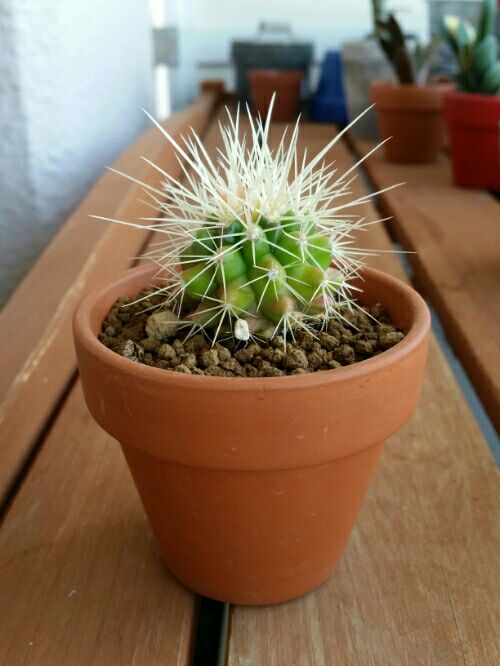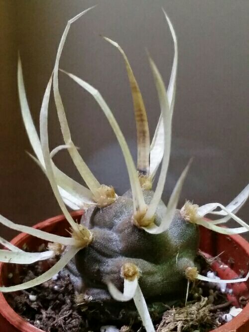 テフロカクタス武蔵野を買ったぞ。 どひゃあ。 カッコいい! 得たいの知れない謎の物体みたいだ。 くすんだ色の球体からペラッペラの長いトゲを出す。 渋谷の東急本店屋上で購入。 1号の小さいヤツだ。 以前から欲しかったのだが、なかなか巡り会わなかった。 売っていても死にそうだったり、トゲが取れていたりで、良いものがなかったのだ。 それに比べてコイツはいい。 他にも1号サボテンがたくさんあったので、入荷したばかりなのかもしれない。 このペラッペラのトゲがいい。 まるで紙みたいだ。 何でこんなペラッペラのトゲになっちゃったんだろう? こんなペラッペラでは外敵から身を守ることはできないんじゃないの? しかし、調べてみるとコイツのトゲはこのペラッペラのトゲだけでは無いらしい。 刺座から無数の細かいトゲが出ていて、それは他のウチワサボテン同様、刺さるとなかなか取れないあの嫌~なトゲらしい。 うちにある姫ウチワのトゲが何度か刺さったことがあるが、鉤トゲになっていて刺さるとホント嫌なのだ。 あれと同じ。 気を付けなければ。 トゲは嫌だが、このカッコ良さで全て帳消しだ! 丸い本体、ペラッペラなトゲ。 いやあ買ってよかった。 いっぱいあったから、もう1個買っときゃよかったかな。 とりあえず半日陰において、1週間後からベランダ最前列に移動しよう。 植え替えもしなくちゃね。 来月ぐらいには植え替えよう。 楽しみだ。 にほんブログ村