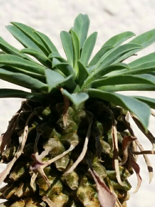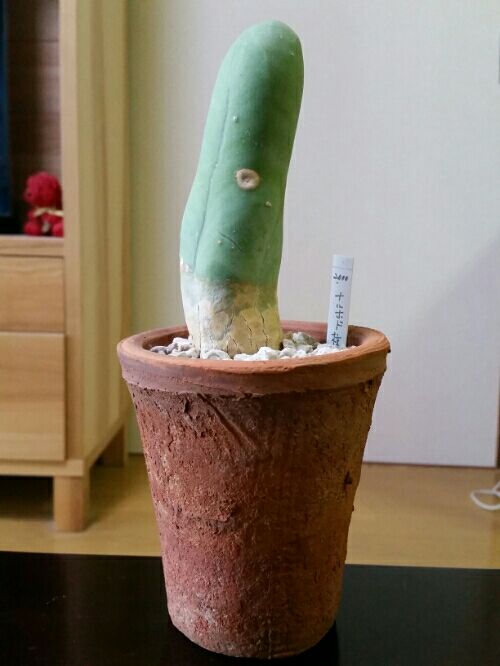 ユーフォルビア蘇鉄キリン。 現在の姿ではない。 今年1月10日の画像だ。 ゴツゴツした幹の天辺に葉が繁る。 パイナップルコーンなどとヘンな名前で売られているのもよく見る。 うちのヤツも確かそうだった。 買ったのは2年前。 2014年4月7日だ。 下の方に仔が3つ吹いているのが確認できるが、この仔吹き、いつの間にか全部無くなってしまった。 これは去年の5月。 ゴツゴツした突起の間からミドリの芽が出てきている。 かなりの数だ。 仔吹きだ! ポコポコ出てくるぞ! と思ったらいつの間にか全部無くなっていた。 仔吹きそうで仔吹かない。 一体何なんだコイツ? ところが現在。 また出たぞ! 去年と違い今度はいきなり葉のようなものが出てきたぞ! 今回はいけるんじゃないの? 去年と同じようなミドリの粒のようなものも出ているが、 コヤツは期待できない。 やっぱコレだよコレ! 仔吹きであって欲しいなあ。 毎日ジロジロ見るぞ! 蘇鉄キリンはベランダにいる。 室内で冬越ししたが3月末から外に出したのだ。 あれから20日あまり。 天辺の葉はまだまだ少ないが、これからどんどん繁るはずだ。 現在ユーフォルビアで生育が確認できるのはコイツと峨眉山ぐらいか。 生育とはいっても非常に緩慢な動きで、夏型多肉であるコイツら、活発に動き出すのはまだ先になるだろう。 とにかく仔吹き。 仔吹きしてほしい。 頑張れ蘇鉄キリン。 応援してるぜ。 にほんブログ村
