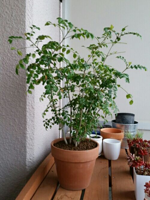 シマトネリコ。 こじゃれたレストランなんかの軒先によく飾ってあるアレだが、うちのはまだまだミニサイズ。 5号鉢に植えている。 買ったのは2014年7月だから、今2年弱が経過したところ。 確かどこかのスーパーで買ったはずだ。 3号ぐらいの大きさだった。 4号ぐらいの鉢にすぐ植え替えた。 生長は速く、8月末にはこのように。 冬もベランダに出しっぱなし。 すると痛んでしまい、3月にはこんなに。 それでも4月後半ぐらいから生長再開し、5月23日植え替え。 5号に昇格。 しかしこの時点でもまだ痛みが残る。 その後は撮影してなかったようで12月。 何だかあまりキレイな育ち方ではないが、背は高くなった。 回りに重石を置いておかないと風で倒れる。 今年は真冬の1月2月は室内に置いていたので痛みはあまり見られない。 最近になって新芽も動いてきた。 生長開始だ。 今年もどんどん伸びそう。 5月には植え替えるかな。 去年、風で3、4回倒れている。 倒れると土がこぼれて掃除が面倒くさい。 今度は倒れないようにもっと安定感のある鉢にしよう。 6号シリンダー鉢を探さないとね。 にほんブログ村
